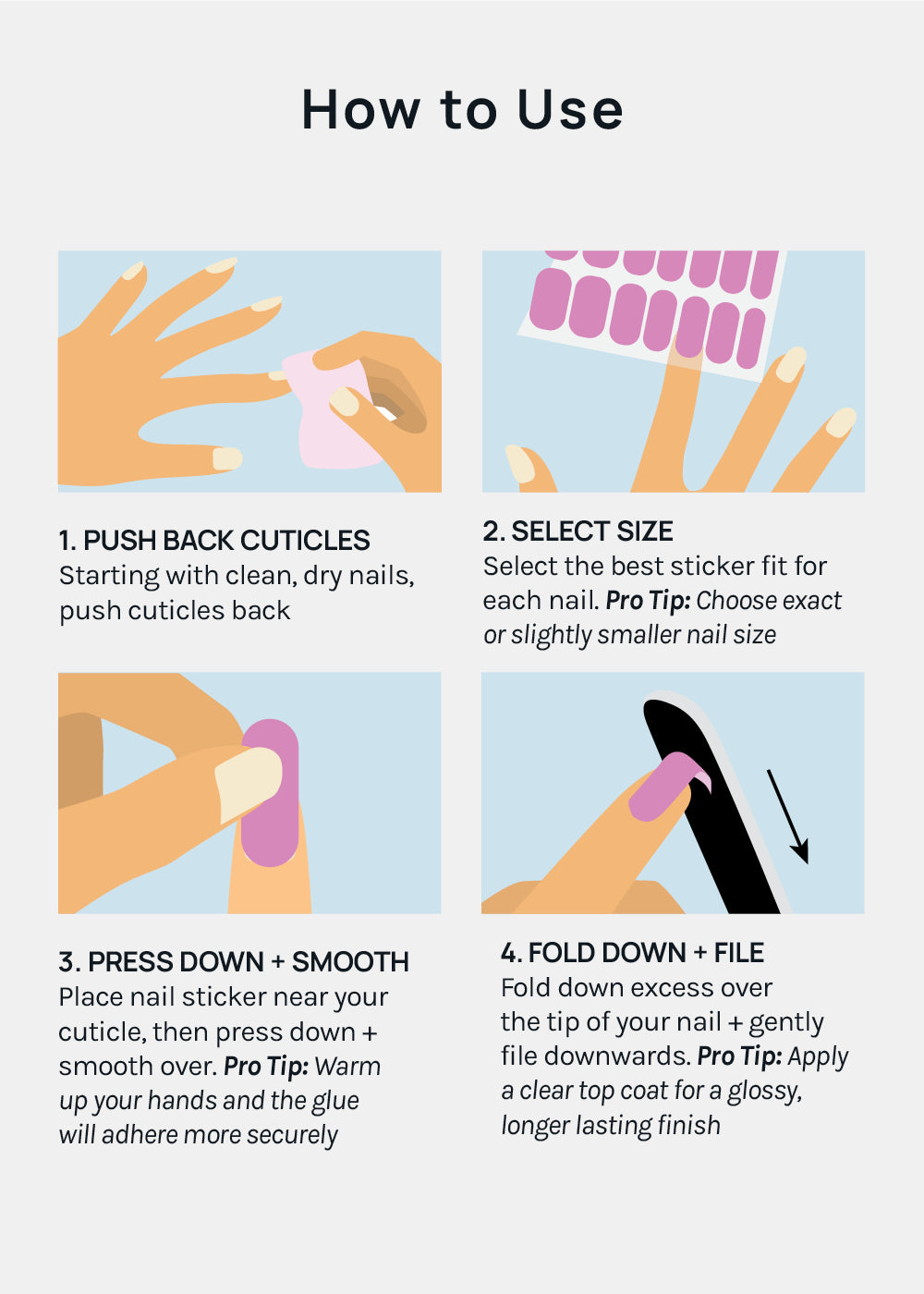 - Place nail sticker near your cuticle, then press down + smooth over. Pro Tip: Warm up your hands and the glue will adhere more securely.