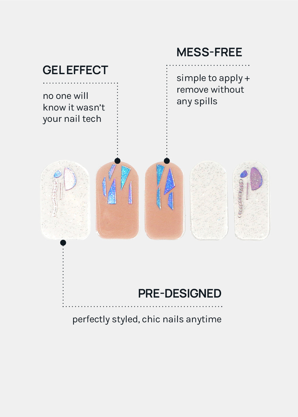 Get an easy mess-free manicure. Just peel, stick, press + file. No glue needed!