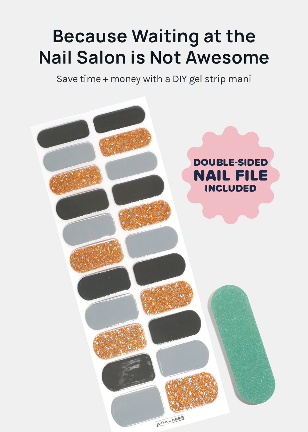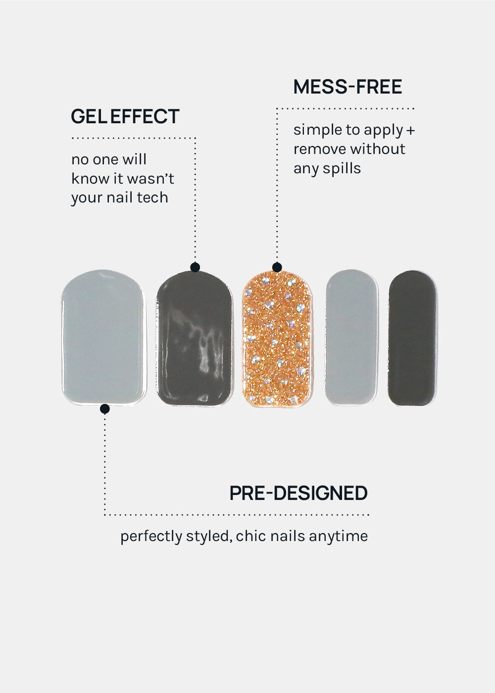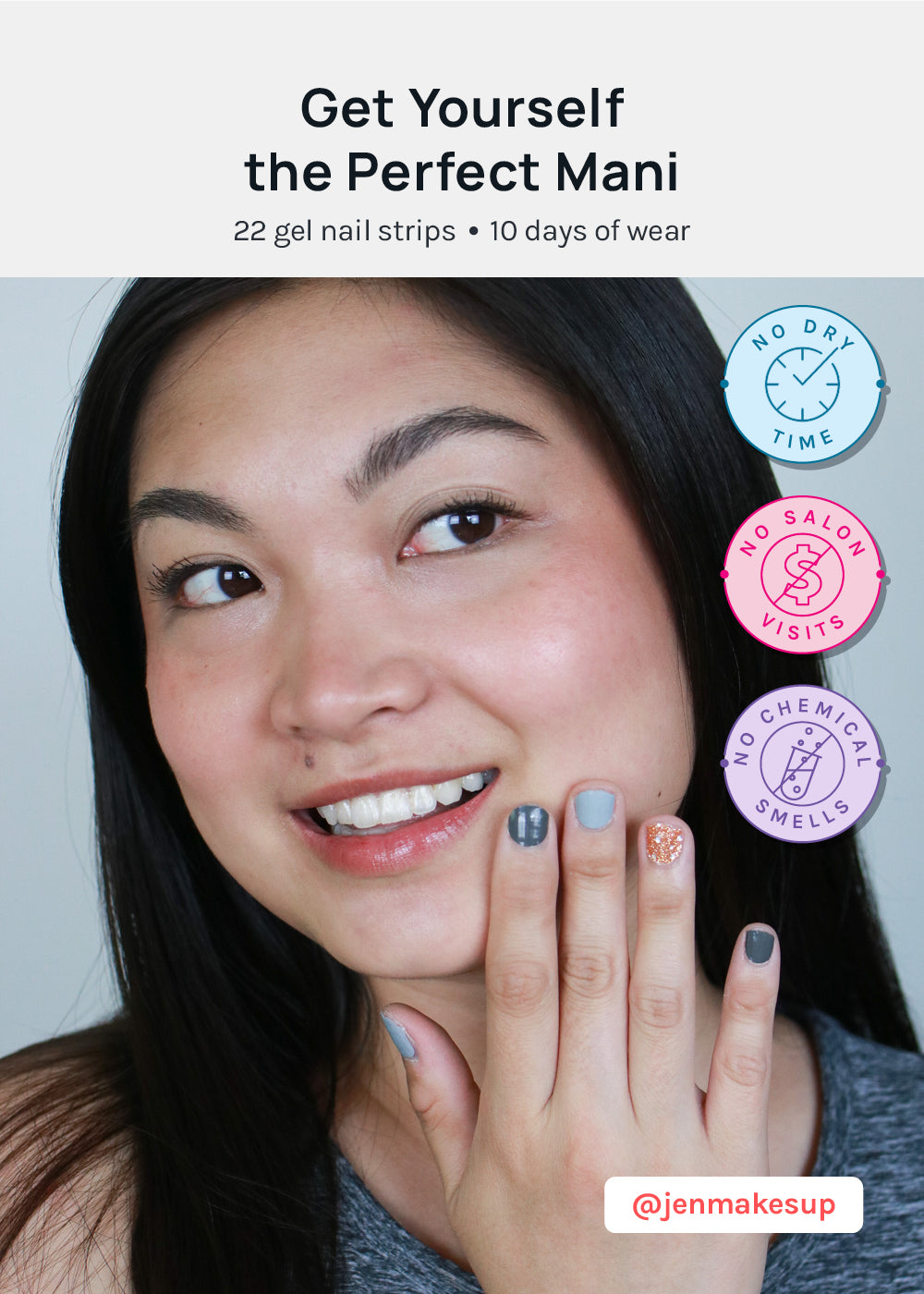 Get an easy mess-free manicure. Just peel, stick, press + file. No glue needed!