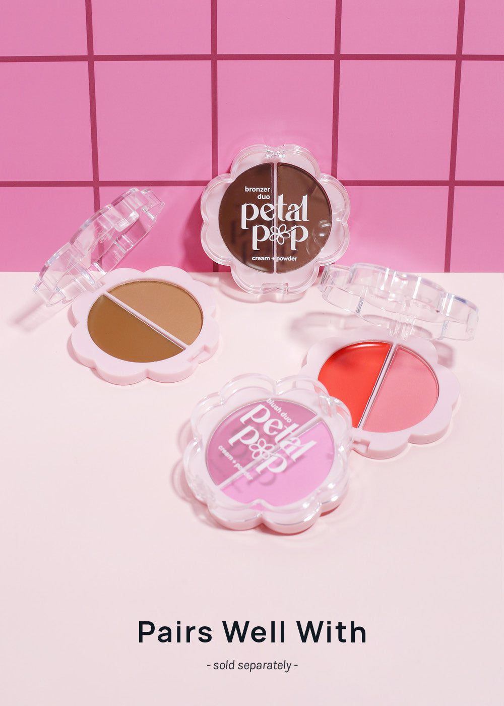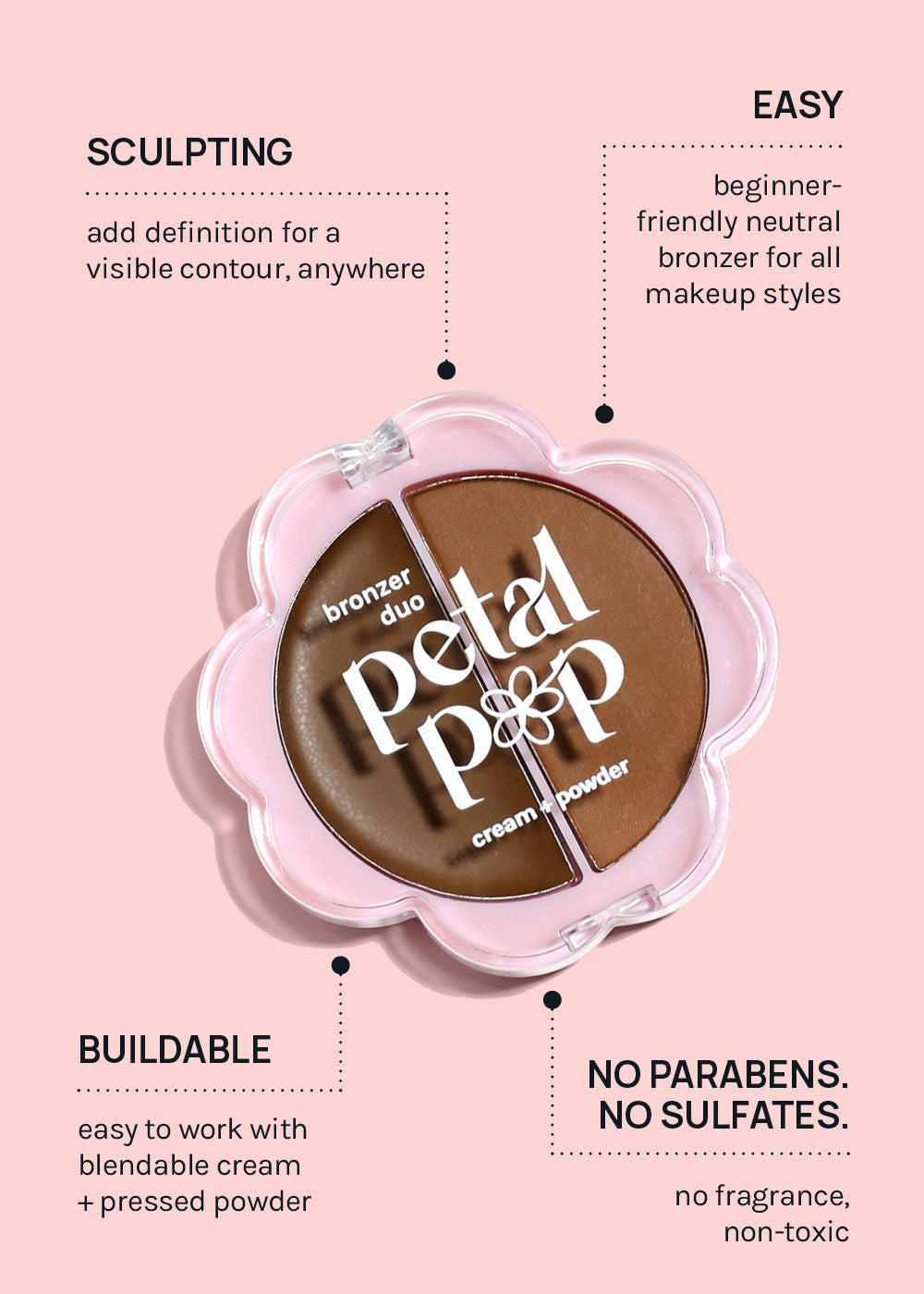 Petal Pop Bronzer Duo brings customizable warmth, definition, + glow in one effortless compact. This versatile cream + powder bronzer duo lets you bronze your way—wear the silky cream bronzer alone for a natural, dewy finish, sweep on the soft-focus powder bronzer for a sun-kissed matte glow, or layer powder over cream for enhanced dimension + longer-lasting wear. The buildable, blendable formulas melt into skin to softly sculpt, define, + enhance your features without looking heavy or streaky. Get your glow in full bloom with Petal Pop Bronzer Duo!