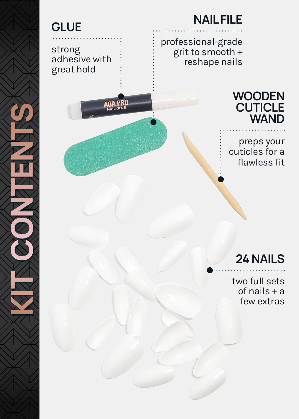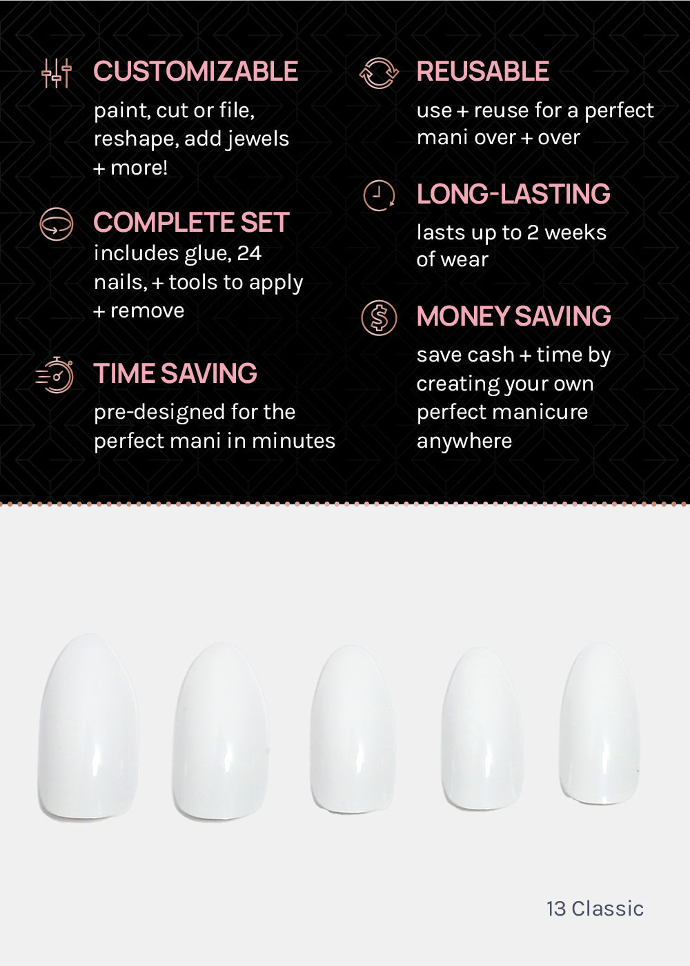 Luxe, durable, reusable nails to create the perfect manicure in minutes.