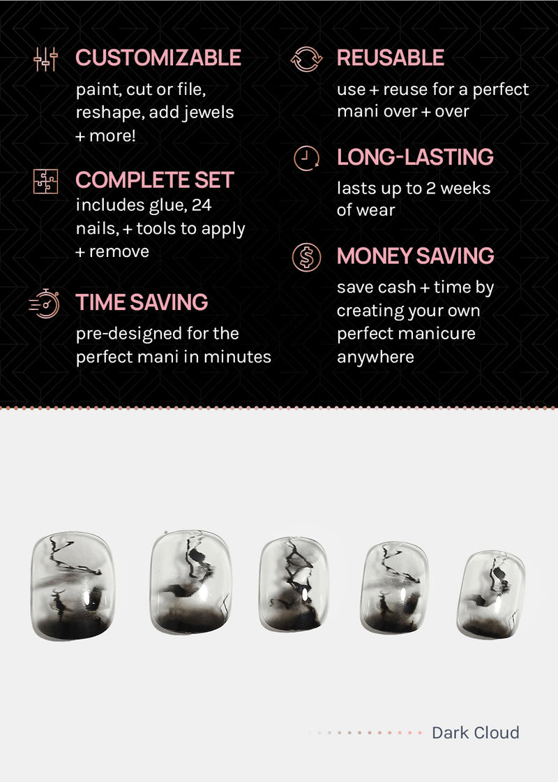 Luxe, durable, reusable nails to create the perfect manicure in minutes.