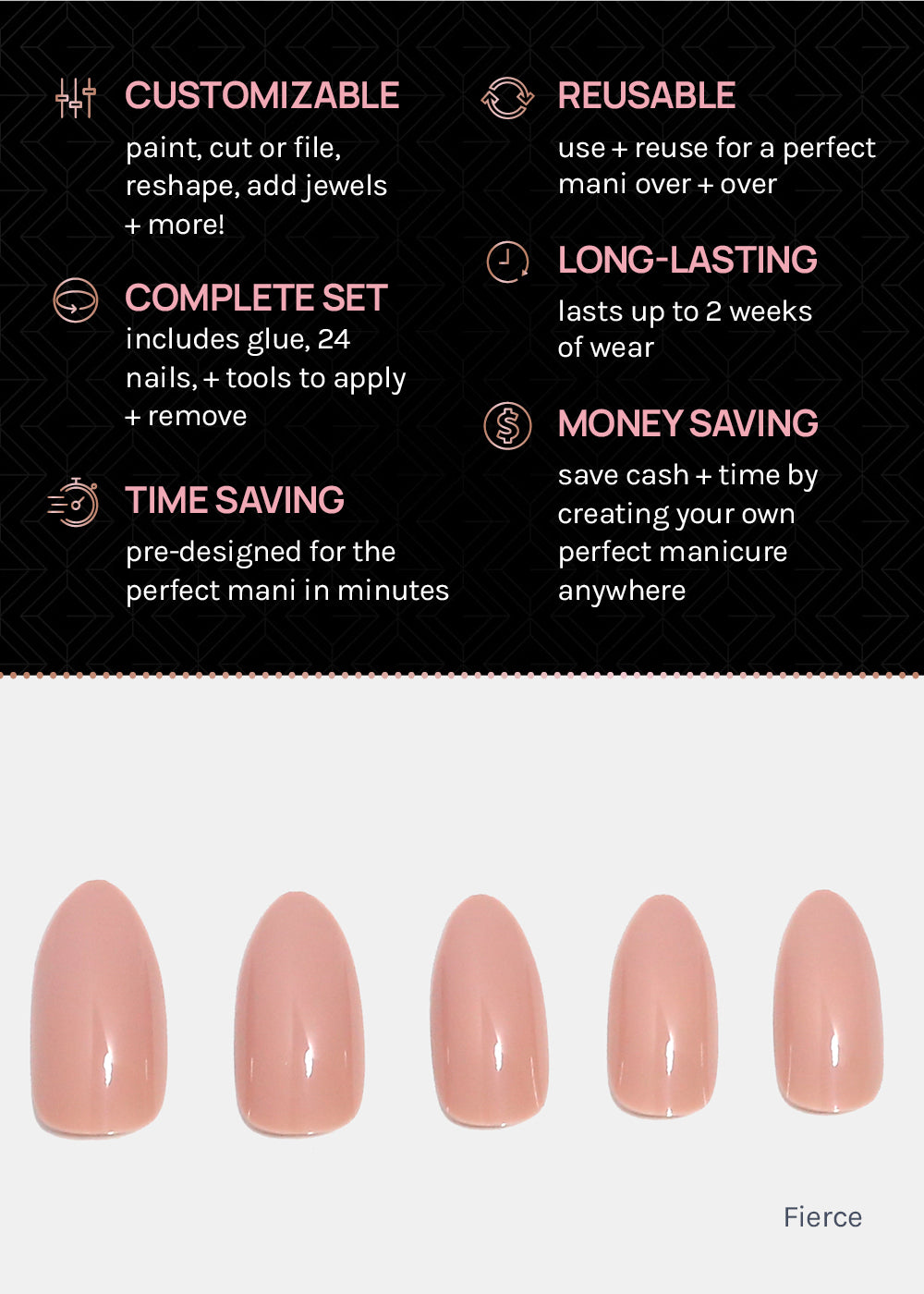 Luxe, durable, reusable nails to create the perfect manicure in minutes.