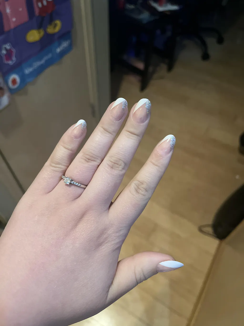 - At a 45º angle, place the press-on nail against the cuticle of your natural nail, press + hold for 5-10 seconds