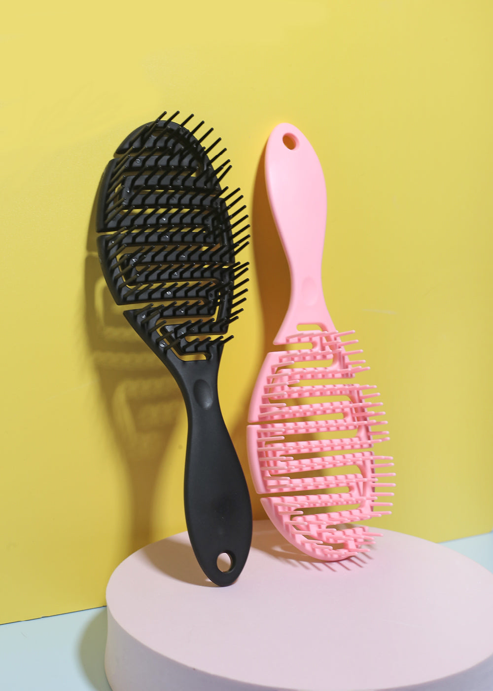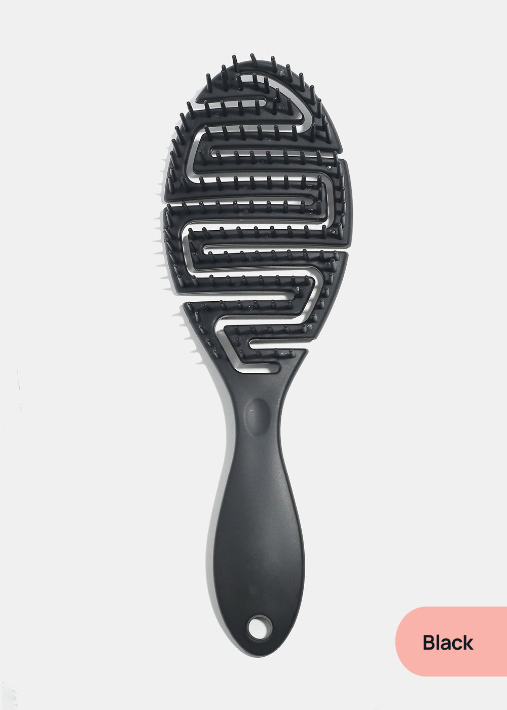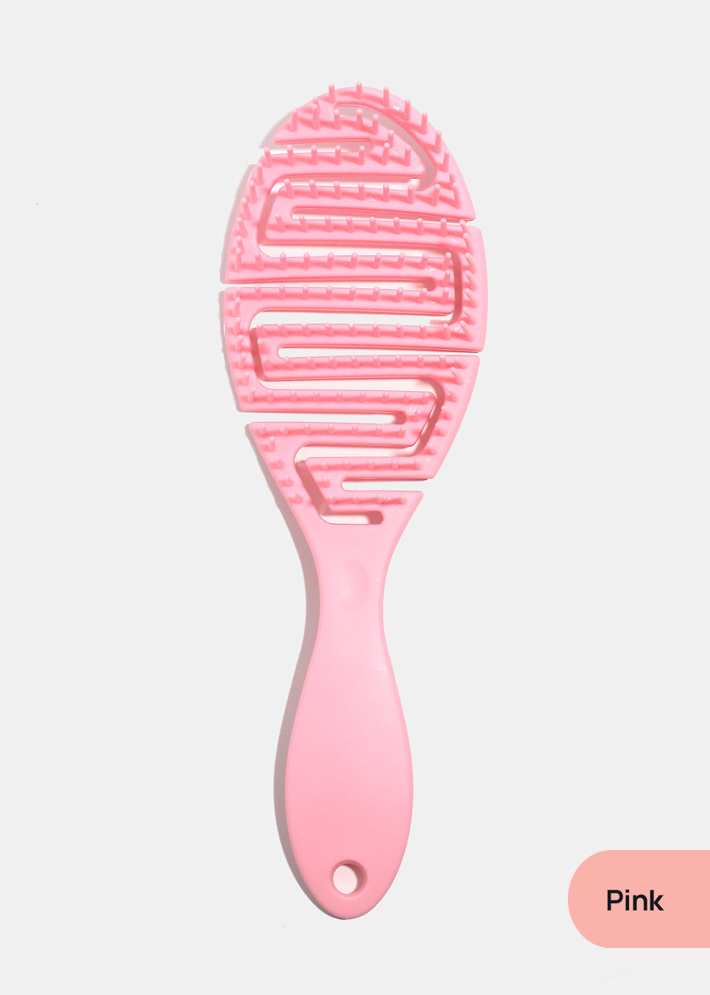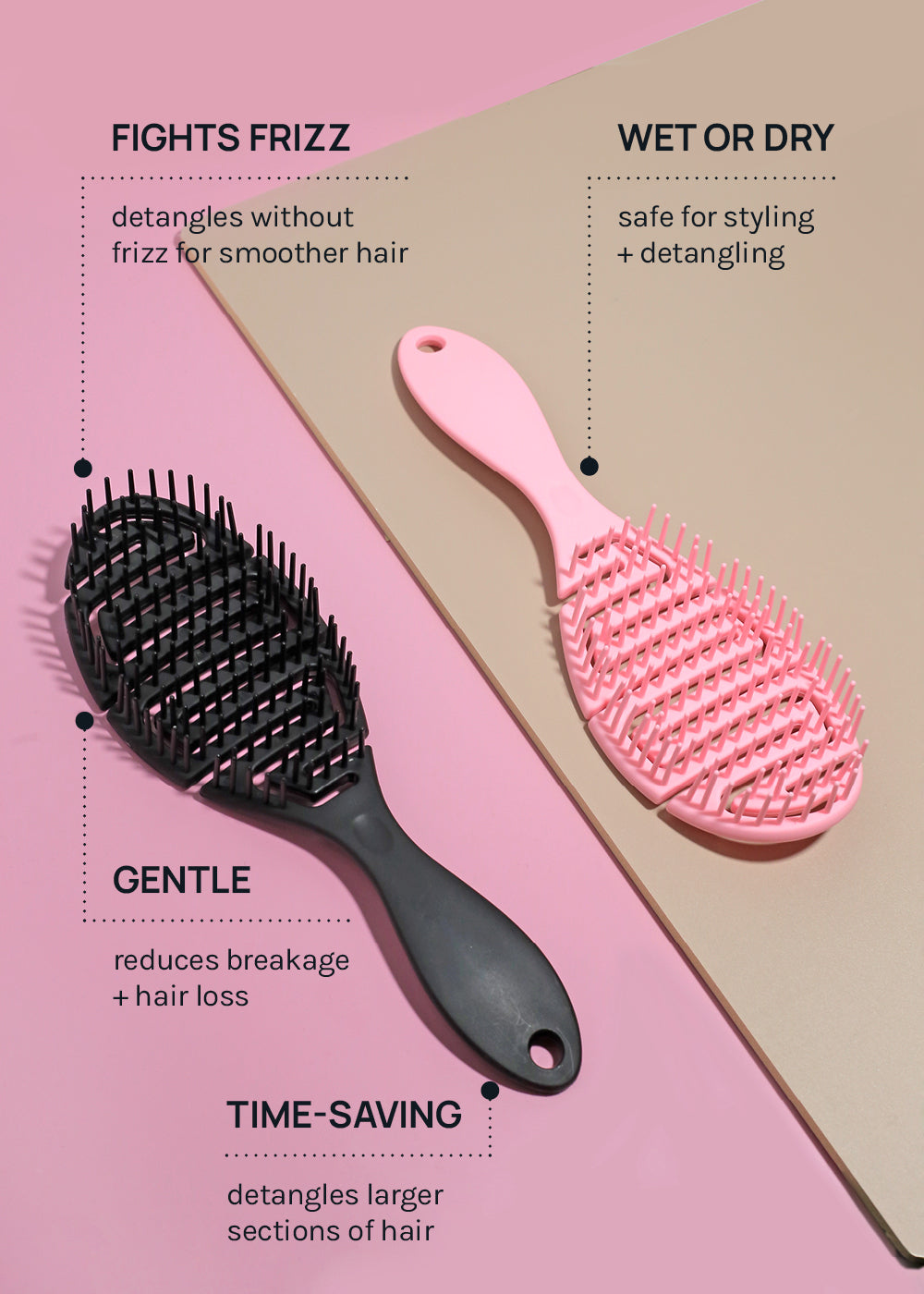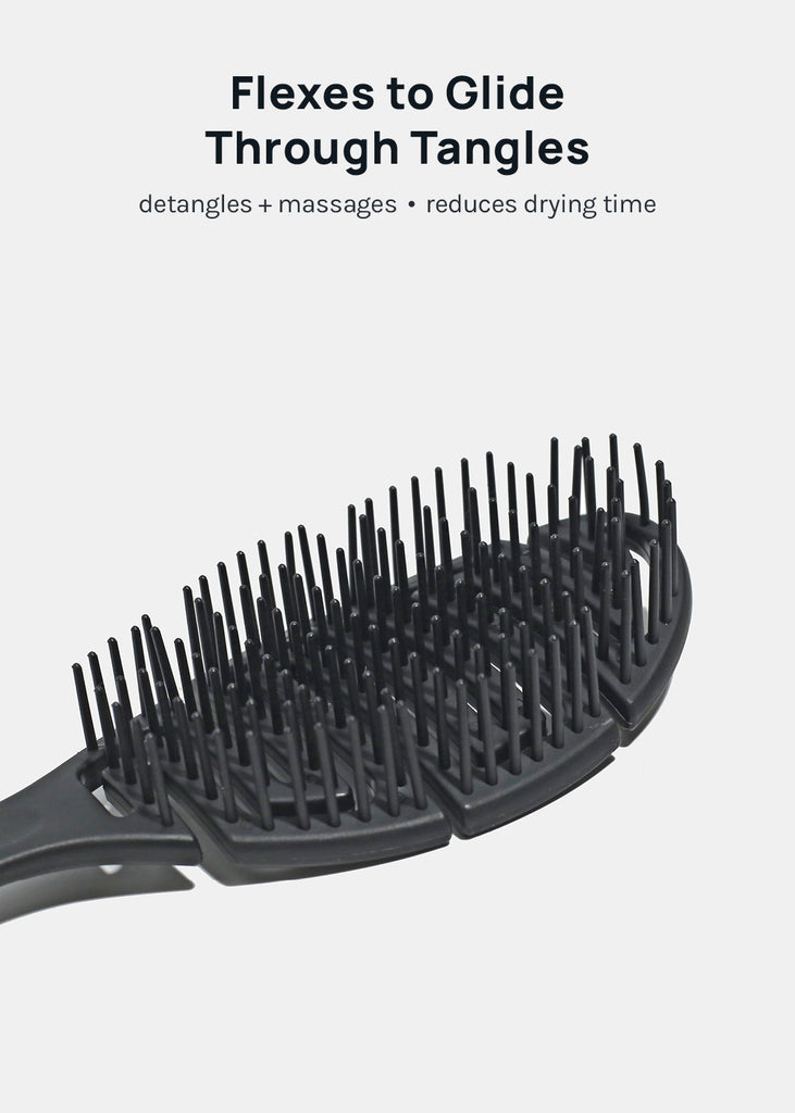 This brush flexes to carefully detangle hair from every angle while massaging the scalp. Its unique shape glides through hair, + the vents reduce drying time.