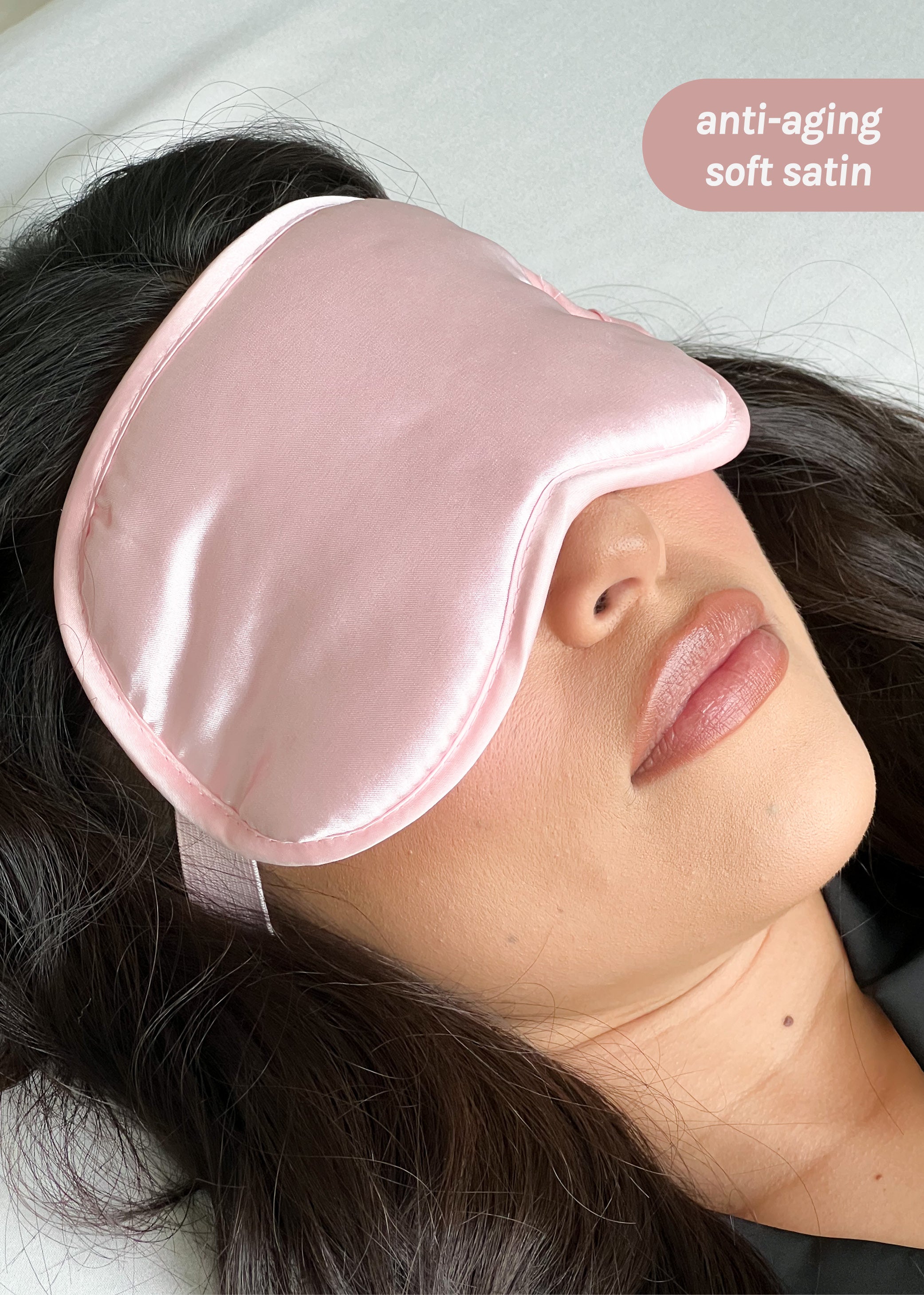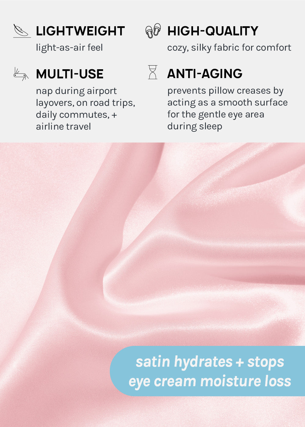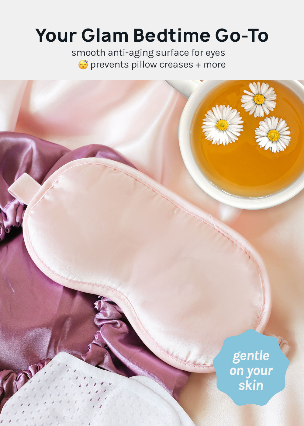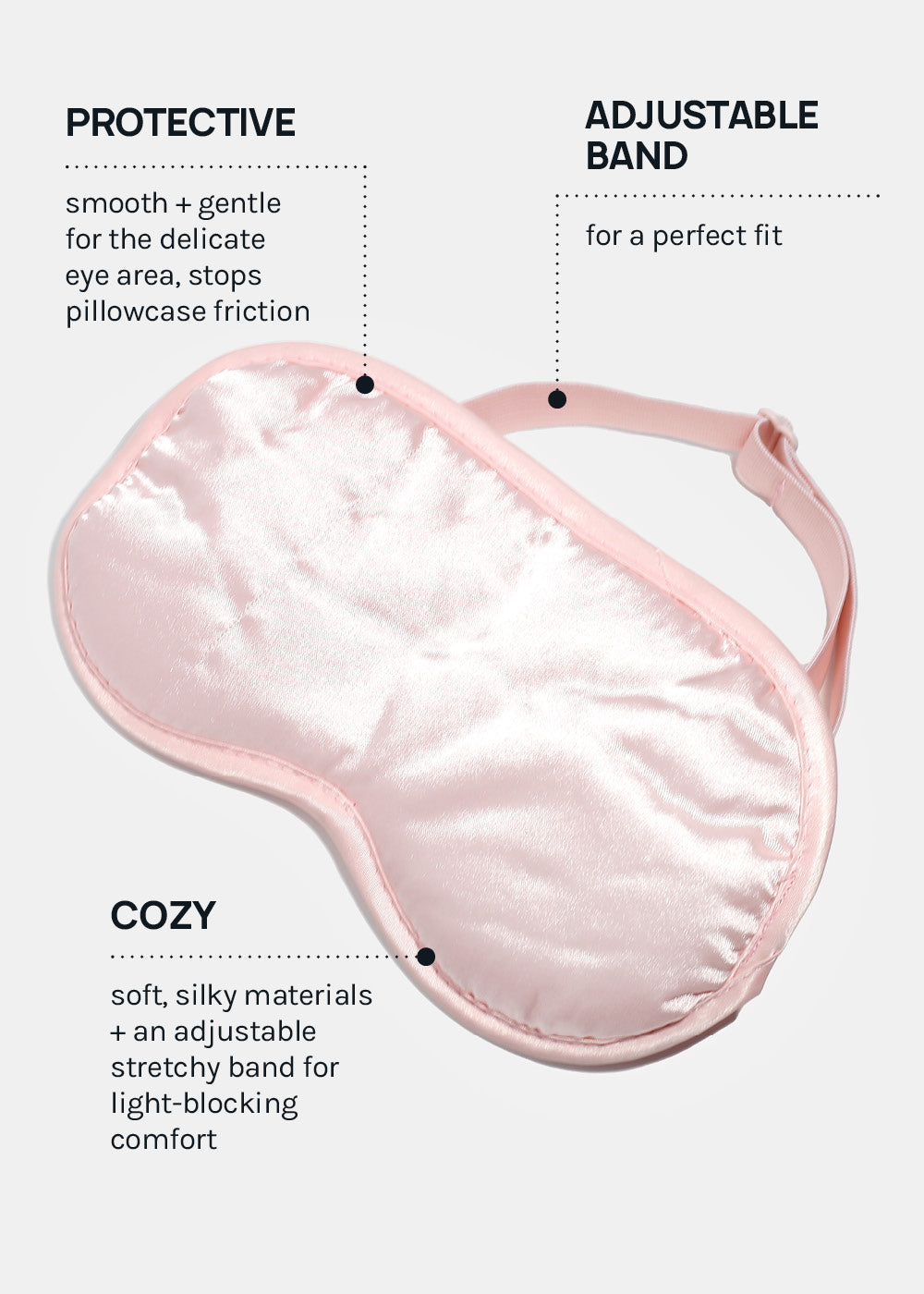 Our Satin Eye Mask is your newest nighttime + travel go-to by helping block out light so you can fall asleep faster, improving your overall sleep quality. It acts as a smooth anti-aging surface for the gentle eye area, preventing pillow creases, friction + more.