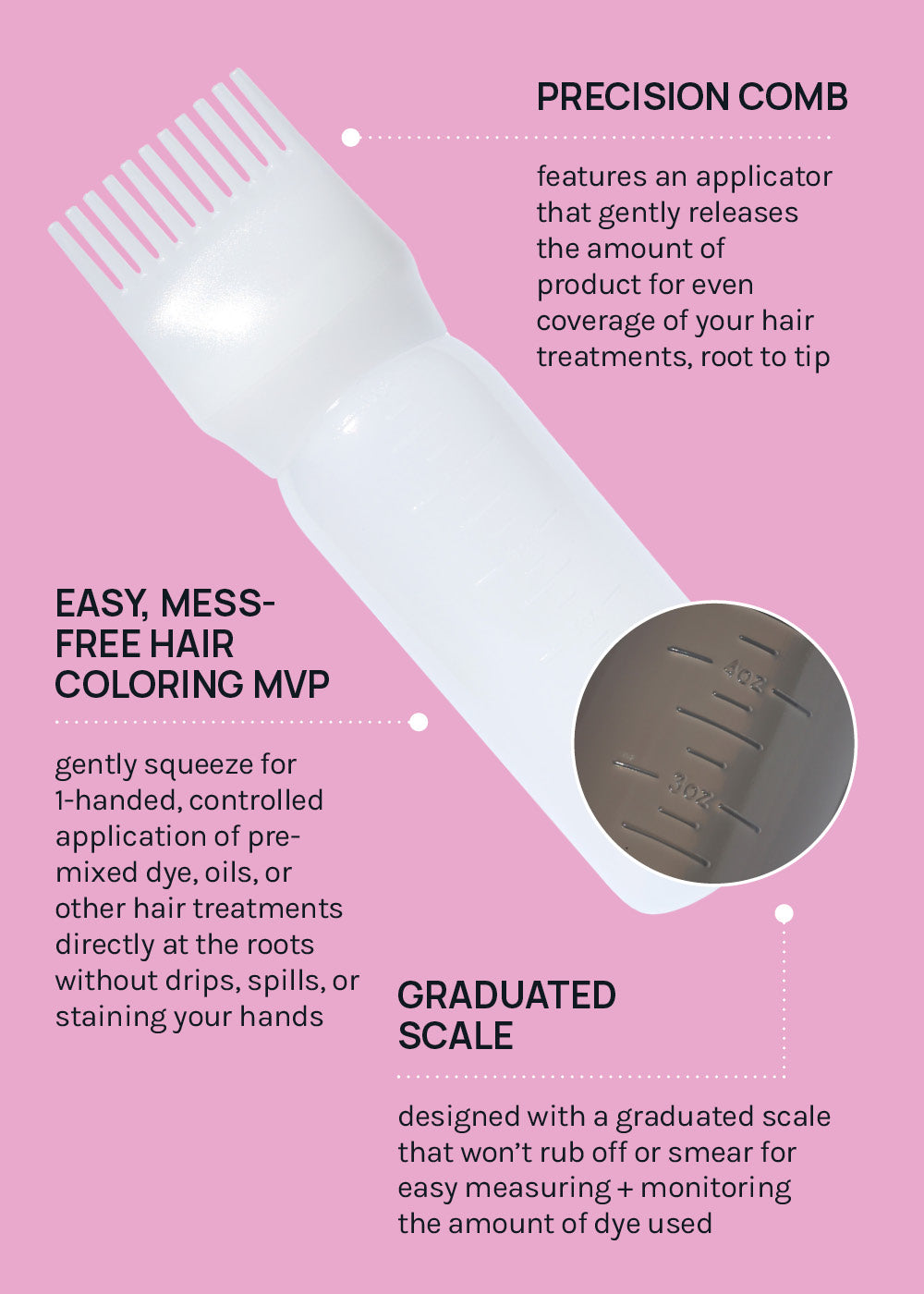 Take the guesswork (+ mess) out of your hair routine with the AOA Scalp Oiling + Coloring Applicator Bottle. This easy-to-squeeze bottle is designed with a built-in comb applicator that lets liquid flow directly through the teeth—delivering hair color, oils, treatments, shampoo, or conditioner straight to your scalp + roots for flawless, even distribution.