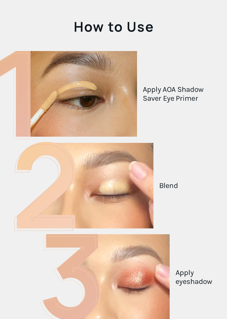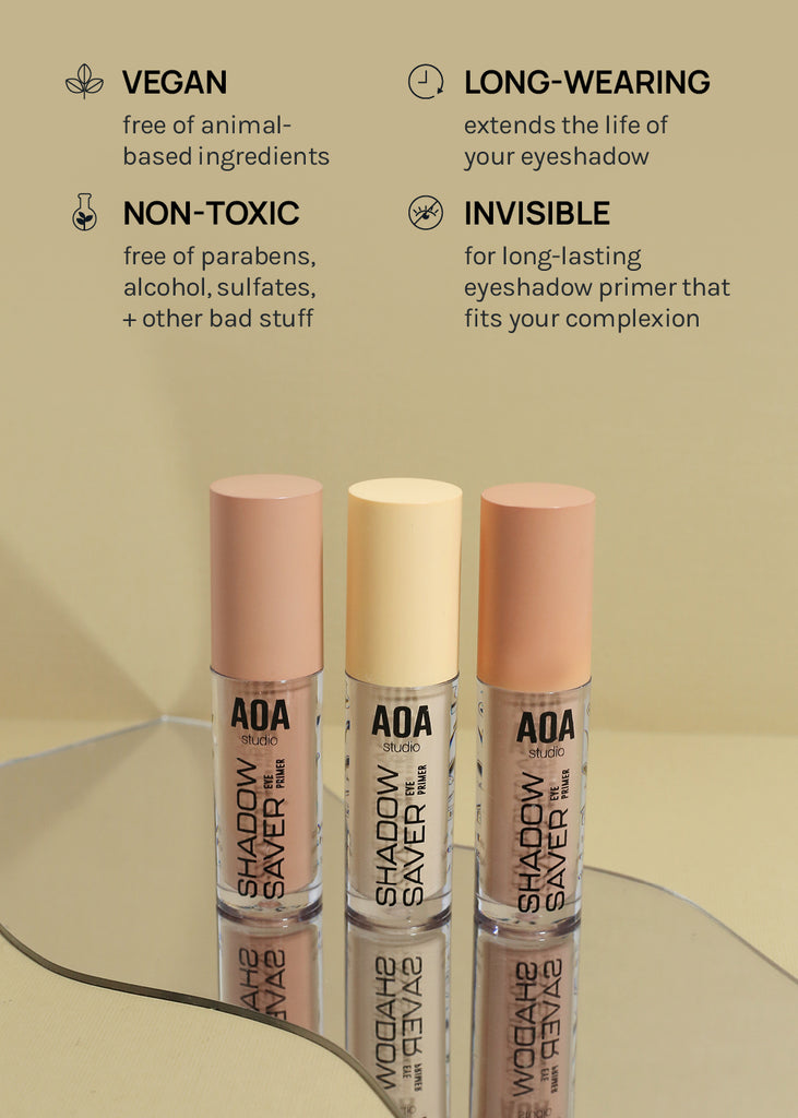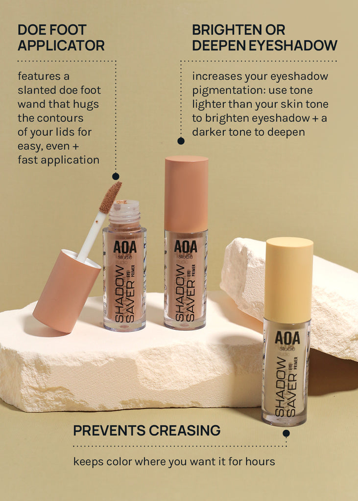 Boost your eyeshadow shades with AOA Shadow Saver Eye Primer! Increases your eyeshadow pigmentation: use a tone lighter than your skin tone to brighten eyeshadow + a darker tone to deepen.