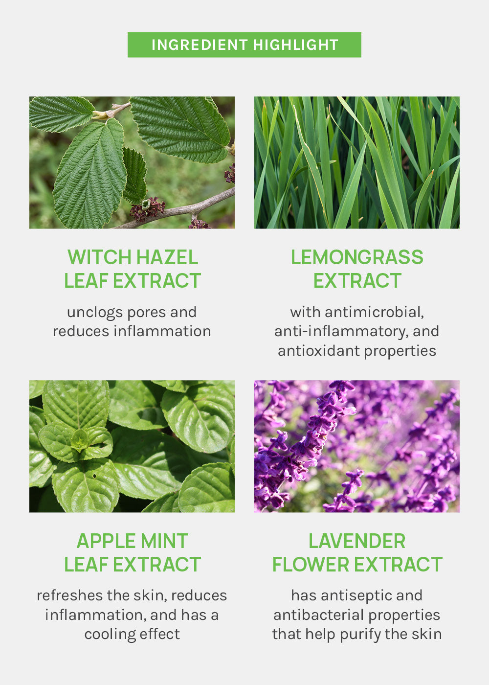 Infused with witch hazel leaf extract to clarify + refine pores, lemongrass + apple mint leaf extracts to purify + refresh, + lavender flower extract to calm + comfort, this one-step essential mask delivers total skin relief + nourishment in minutes.
