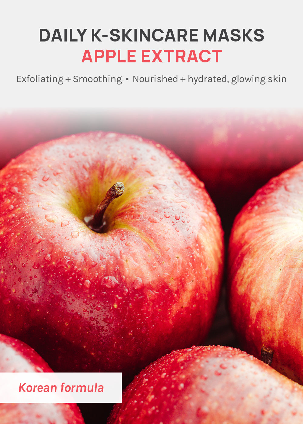 Revitalize + hydrate your skin daily with the AOA Skin Apple Daily Care Sheet Mask, designed to nourish tired, dull skin + restore a healthy, radiant glow. Infused with Pyrus Malus (Apple) Juice, this mask delivers essential nutrients and moisture to keep your skin soft, refreshed, + vibrant.