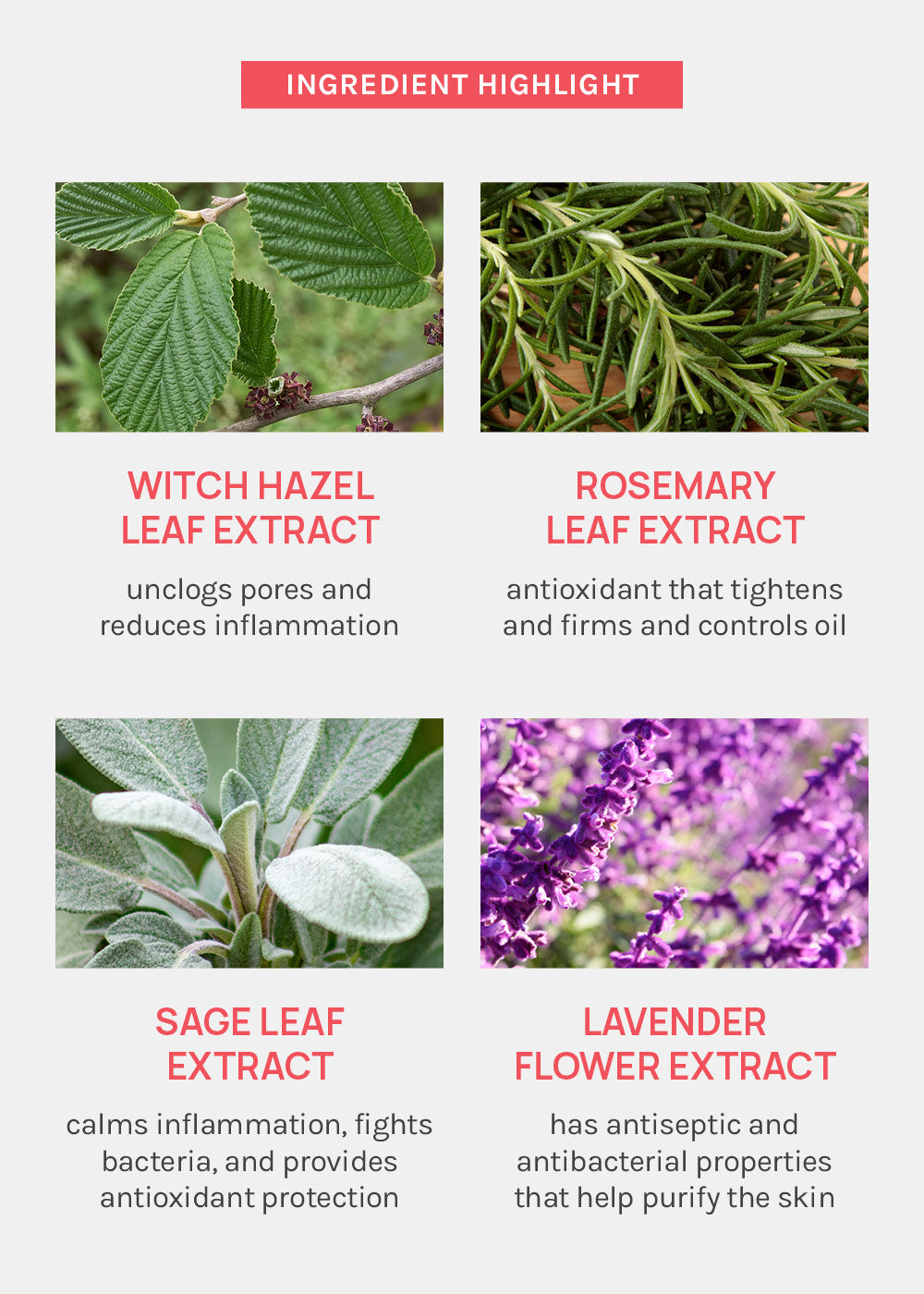 Enhanced with witch hazel leaf extract to refine pores, sage leaf extract to purify, lavender flower extract to soothe, + rosemary leaf extract to refresh, this sheet mask provides gentle, daily care for all skin types.