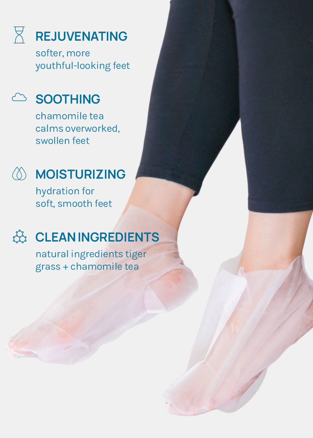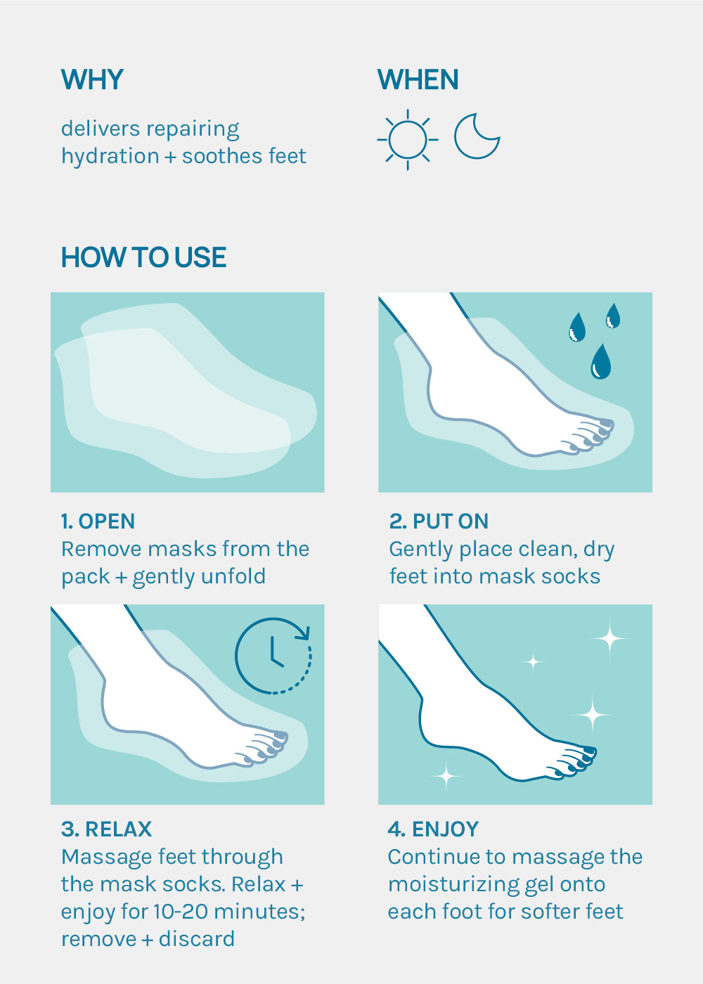3. RELAX Massage feet through the mask socks. Relax + enjoy for 10-20 minutes; remove + discard.