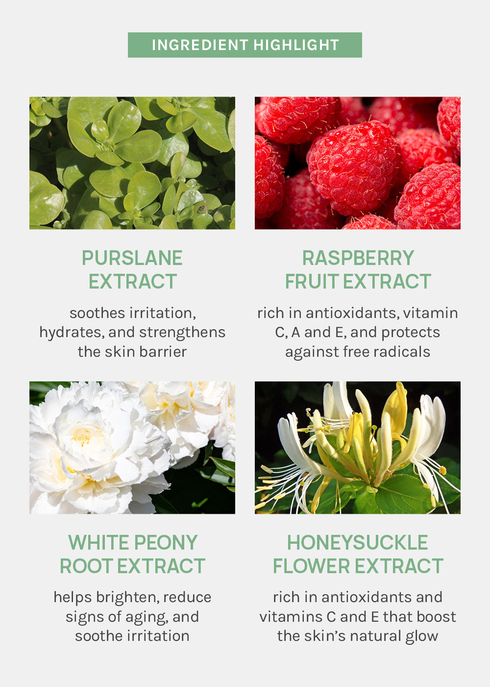 Enhanced with a blend of white peony root extract, purslane extract, raspberry fruit extract, + honeysuckle flower extract, this formula nourishes, soothes, + helps revitalize dull, dry skin.