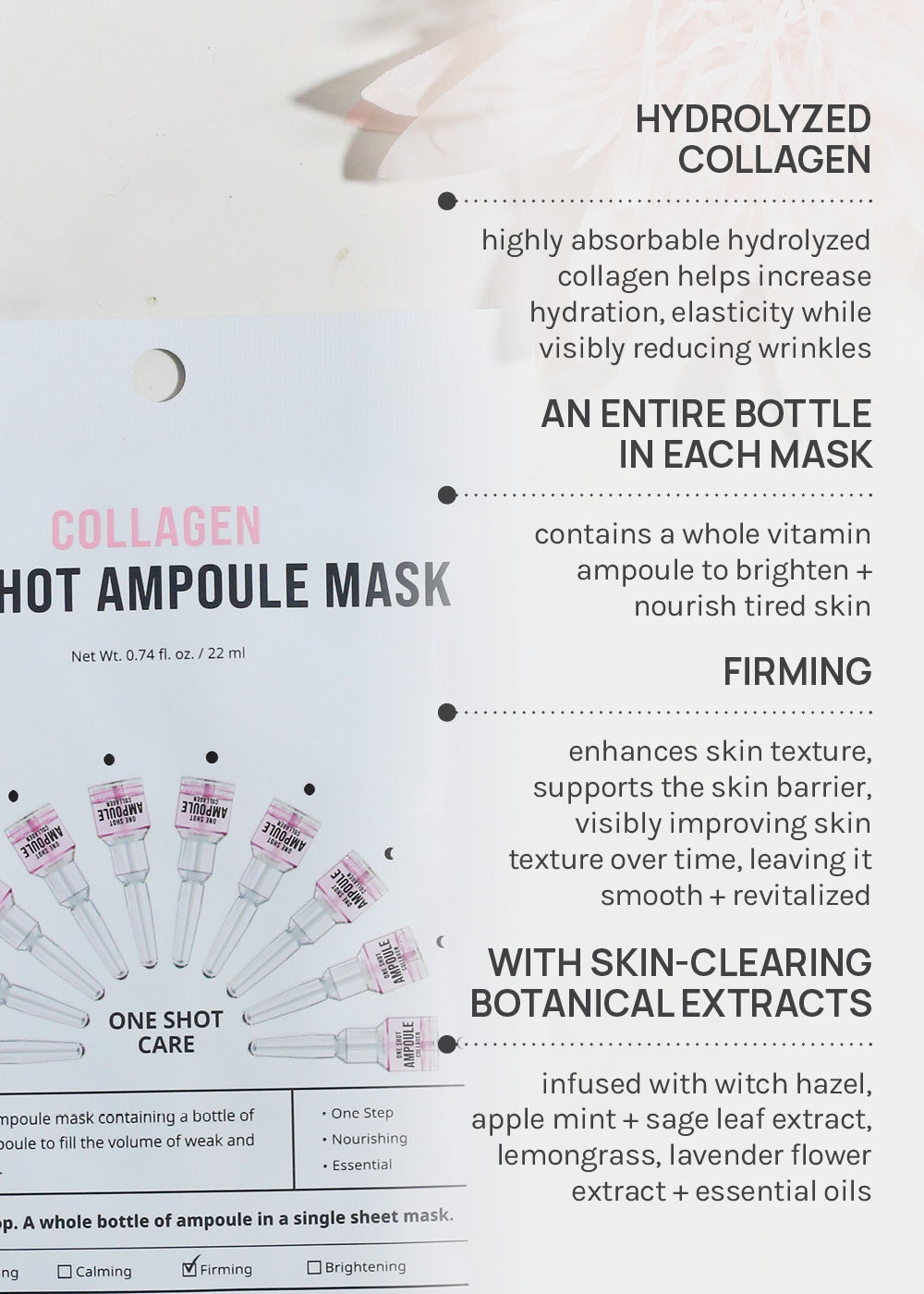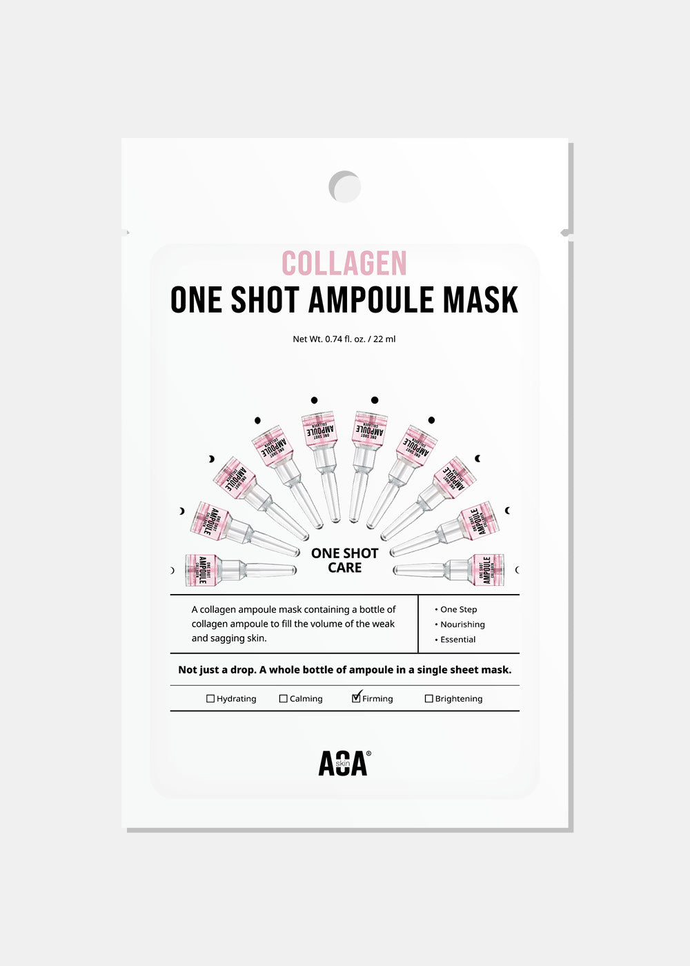 Firm, plump, + rejuvenate your skin with a full bottle of collagen ampoule infused into one ultra-nourishing sheet mask! The AOA Skin Collagen One Shot Ampoule Mask is designed to restore elasticity + volume to weak, sagging skin, helping to smooth the appearance of fine lines + promote a youthful, lifted look.