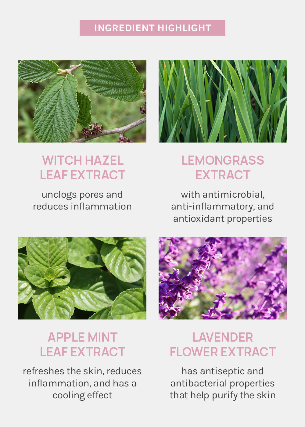 Enriched with witch hazel leaf extract to refine pores, lemongrass + apple mint leaf extracts to refresh + purify, + lavender flower extract to soothe + calm, this essential one-step mask delivers total skin care in just minutes.