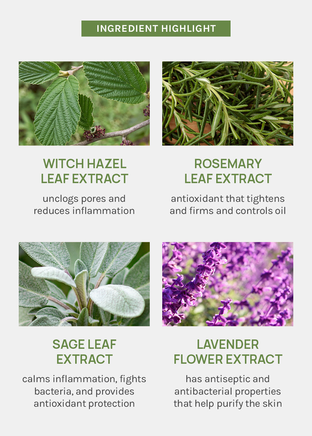 Enhanced with witch hazel leaf extract to refine pores, sage leaf extract to purify, lavender flower extract to soothe, + rosemary leaf extract to refresh, this sheet mask provides gentle, daily care for all skin types.