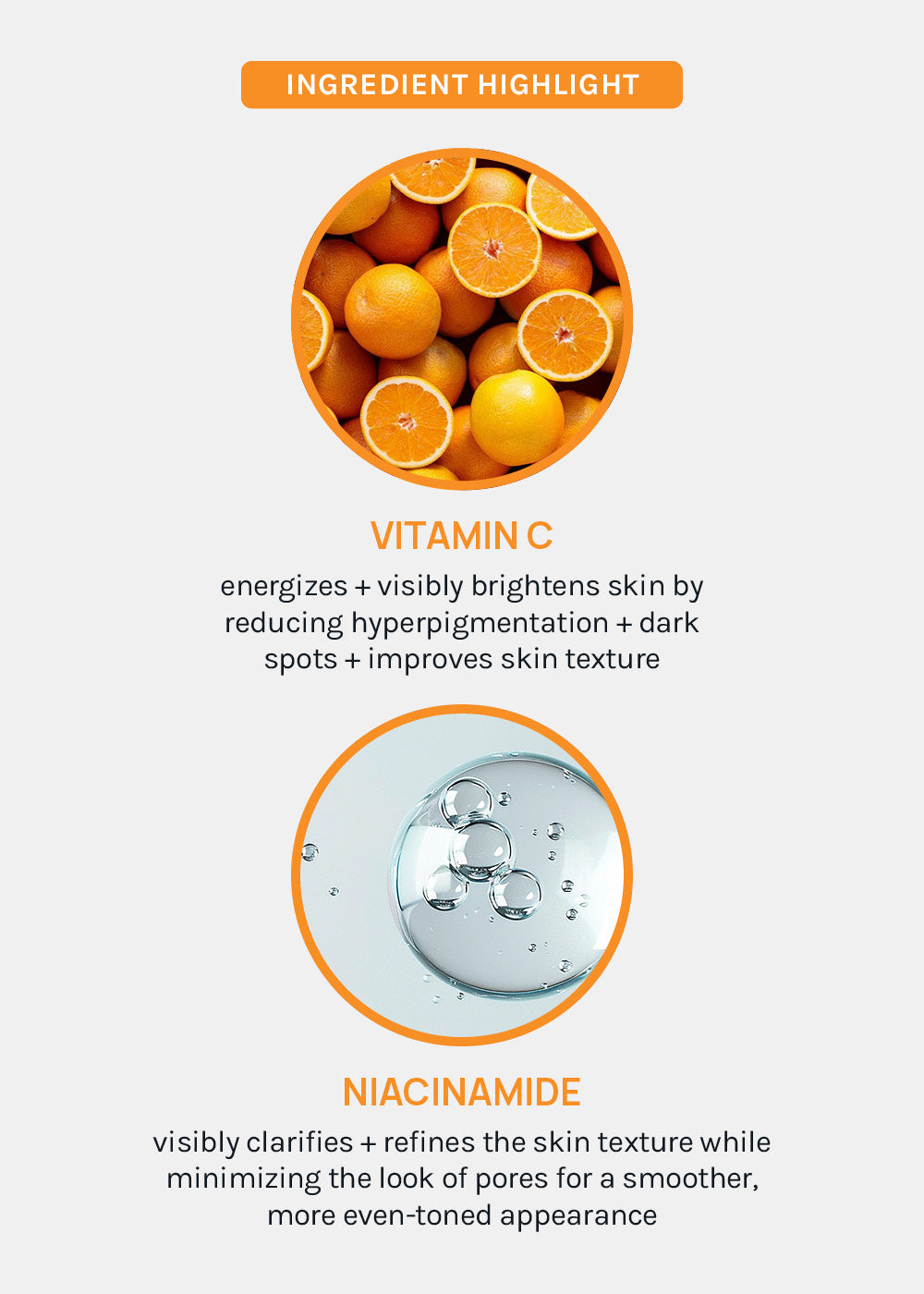 Vitamin C: Aqua, Glycerin, Methylpropanediol, Spirulina Maxima Extract, PEG/PPG-14/7 Dimethylether, 1,2-Hexanediol, Hydroxyacetophenone, Panthenol, Carbomer, Aminomethyl Propanol, Hydroxyethylcellulose, Disodium Phosphate, Sodium Phosphate, Polysorbate 60, Sodium Hyaluronate, PEG-40 Hydrogenated Castor Oil, Citrus Aurantium Dulcis (Orange) Peel Oil, 3-0-Ethyl Ascorbic Acid, Niacinamide, Tocopheryl Acetate, Pyridoxine HCL, Cyanocobalamin, Butylene Glycol, Centella Asiatica Extract, Polygonum Cuspidatum Root Extract, Scutellaria Baicalensis Root Extract, Camellia Sinensis Lea Extract, Glycyrrhiza Glabra (Licorice) Root Extract, Chamomilla Recutita (Matricaria) Flower Extract, Rosmarinus Officinalis (Rosemary) Leaf Extract
