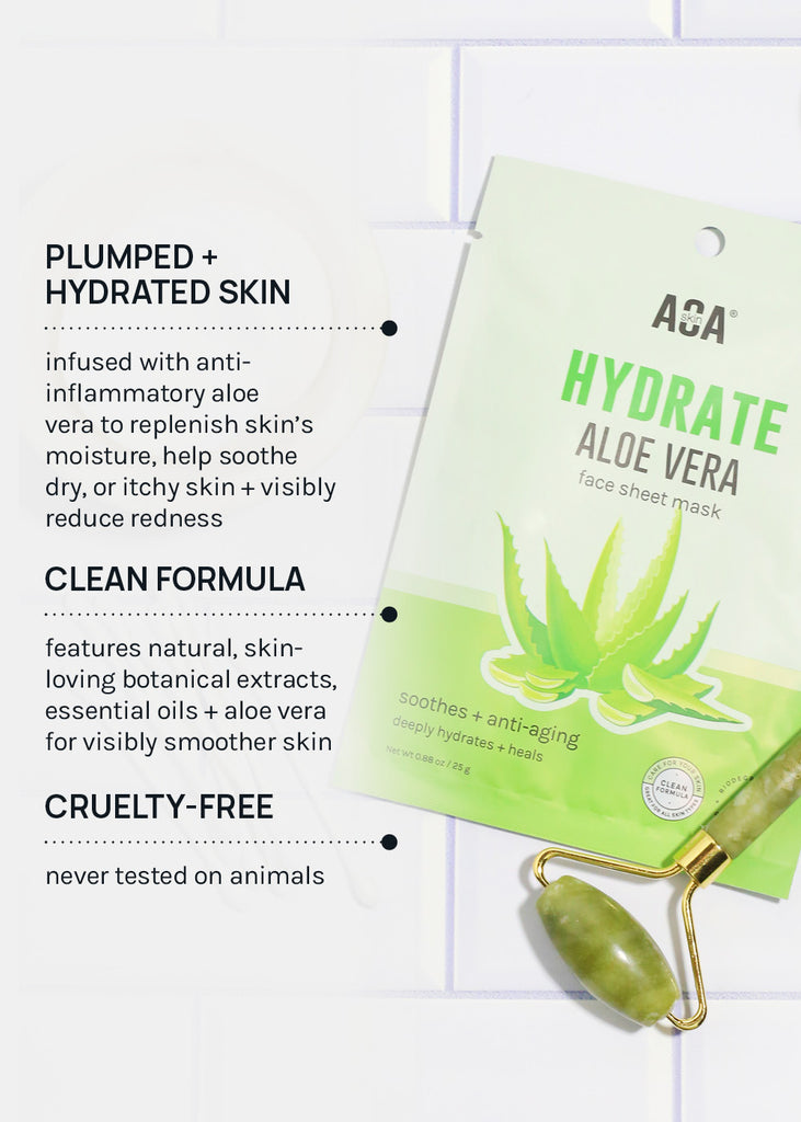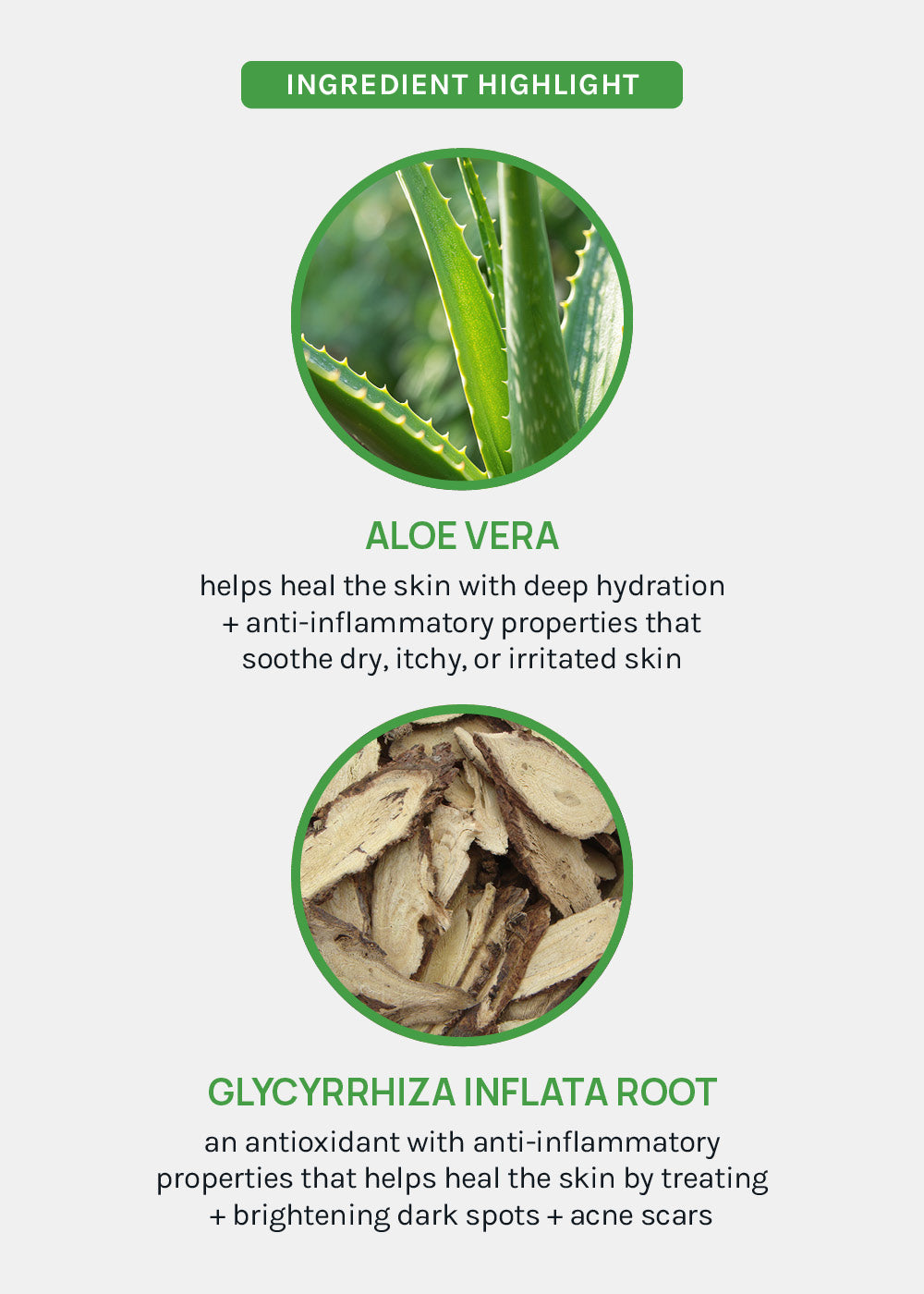 Aloe Vera: Aqua, Glycerin, Methylpropanediol, Spirulina Maxima Extract, PEG/PPG-14/7 Dimethylether, 1,2-Hexanediol, Hydroxyacetophenone, Panthenol, Carbomer, Aminomethyl Propanol, Hydroxyethylcellulose, Disodium Phosphate, Sodium Phosphate, Polysorbate 60, Sodium Hyaluronate, PEG-40 Hydrogenated Castor Oil, Fragrance, Aloe Barbadensis Leaf Extract, Propanediol, Butylene Glycol, Scutellaria Baicalensis Root Extract, Sophora Flavescens Root Extract, Glycyrrhiza Inflata Root Extract, Glycine, Alanine, Isoleucine, Proline, Aspartic Acid, Phyllacantha Fibrosa Extract, Ethylhexylglycerin
