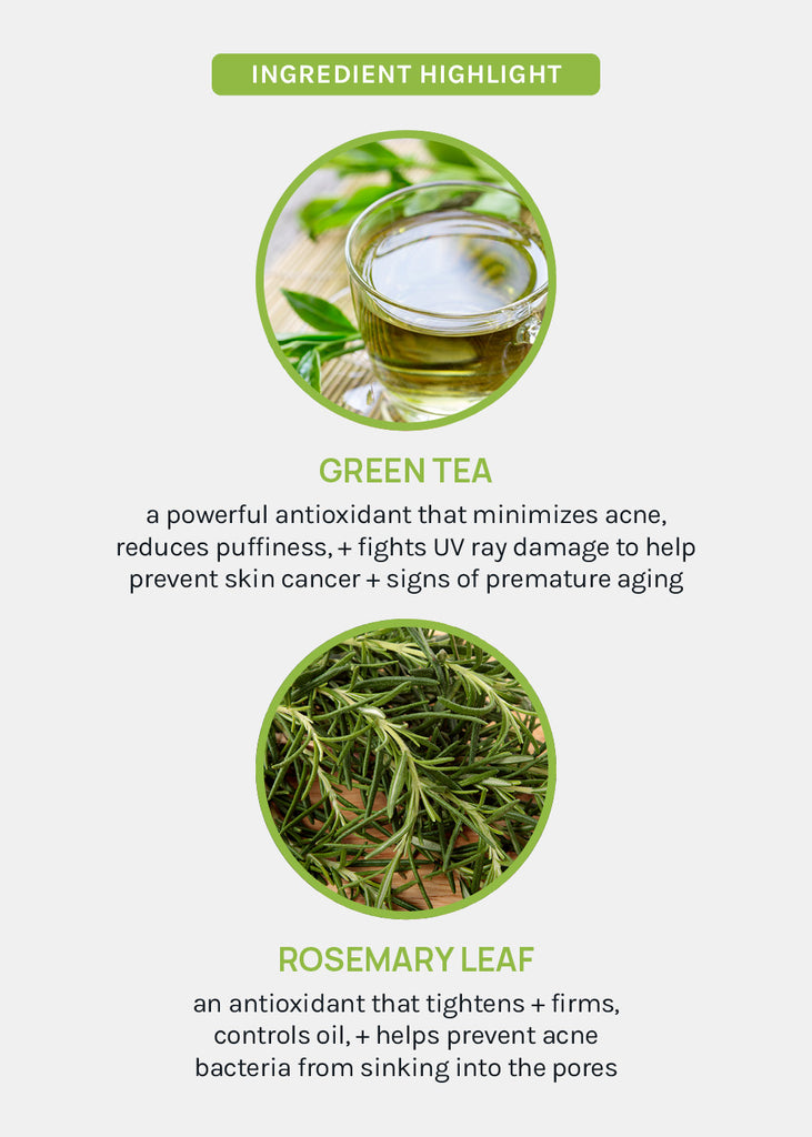 Green Tea: Aqua, Glycerin, Methylpropanediol, Spirulina Maxima Extract, PEG/PPG-14/7 Dimethylether, 1,2-Hexanediol, Hydroxyacetophenone, Panthenol, Carbomer, Aminomethyl Propanol, Hydroxyethylcellulose, Disodium Phosphate, Sodium Phosphate, Polysorbate 60, Sodium Hyaluronate, PEG-40 Hydrogenated Castor Oil, Fragrance, Hamamelis Virginiana (Witch Hazel) Water, Methylparaben, Butylene Glycol, Centella Asiatica Extract, Polygonum Cuspidatum Root Extract, Scutellaria Baicalensis Root Extract, Camellia Sinensis (Green Tea) Leaf Extract, Glycyrrhiza Glabra (Licorice) Root Extract, Chamomilla Recutita (Matricaria) Flower Extract, Rosmarinus Officinalis (Rosemary) Leaf Extract