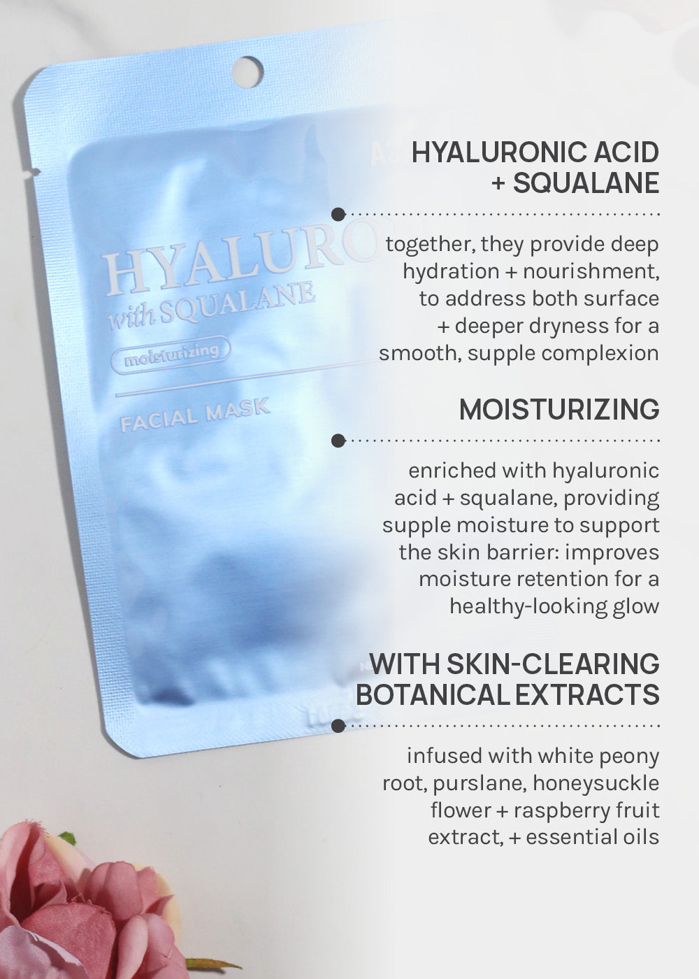 Quench your skin’s thirst with the AOA Skin Hyaluron with Squalane Moisturizing Facial Mask, a deeply hydrating treatment that leaves your complexion soft, supple, + glowing. Infused with hyaluronic acid to lock in moisture + squalane to strengthen the skin’s natural barrier, this mask delivers long-lasting hydration + a dewy, healthy finish.