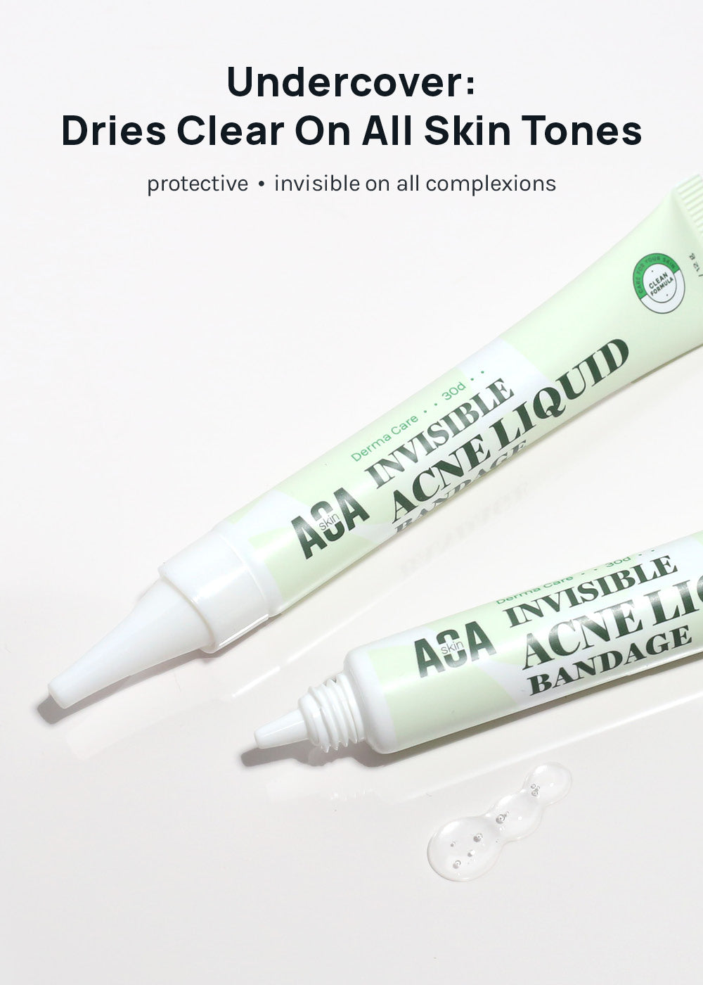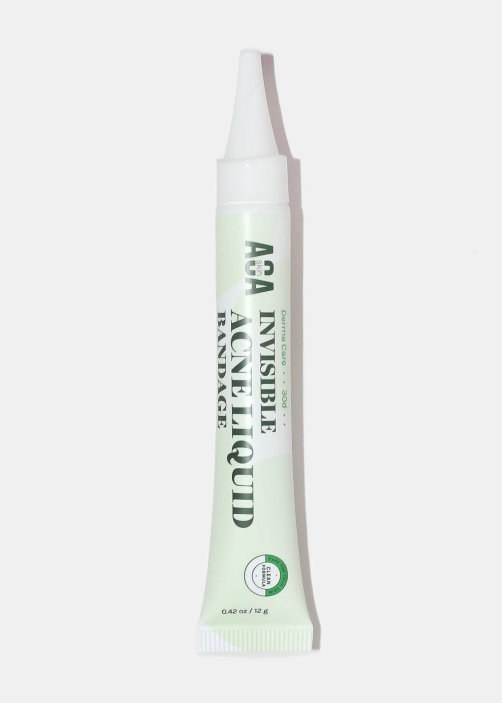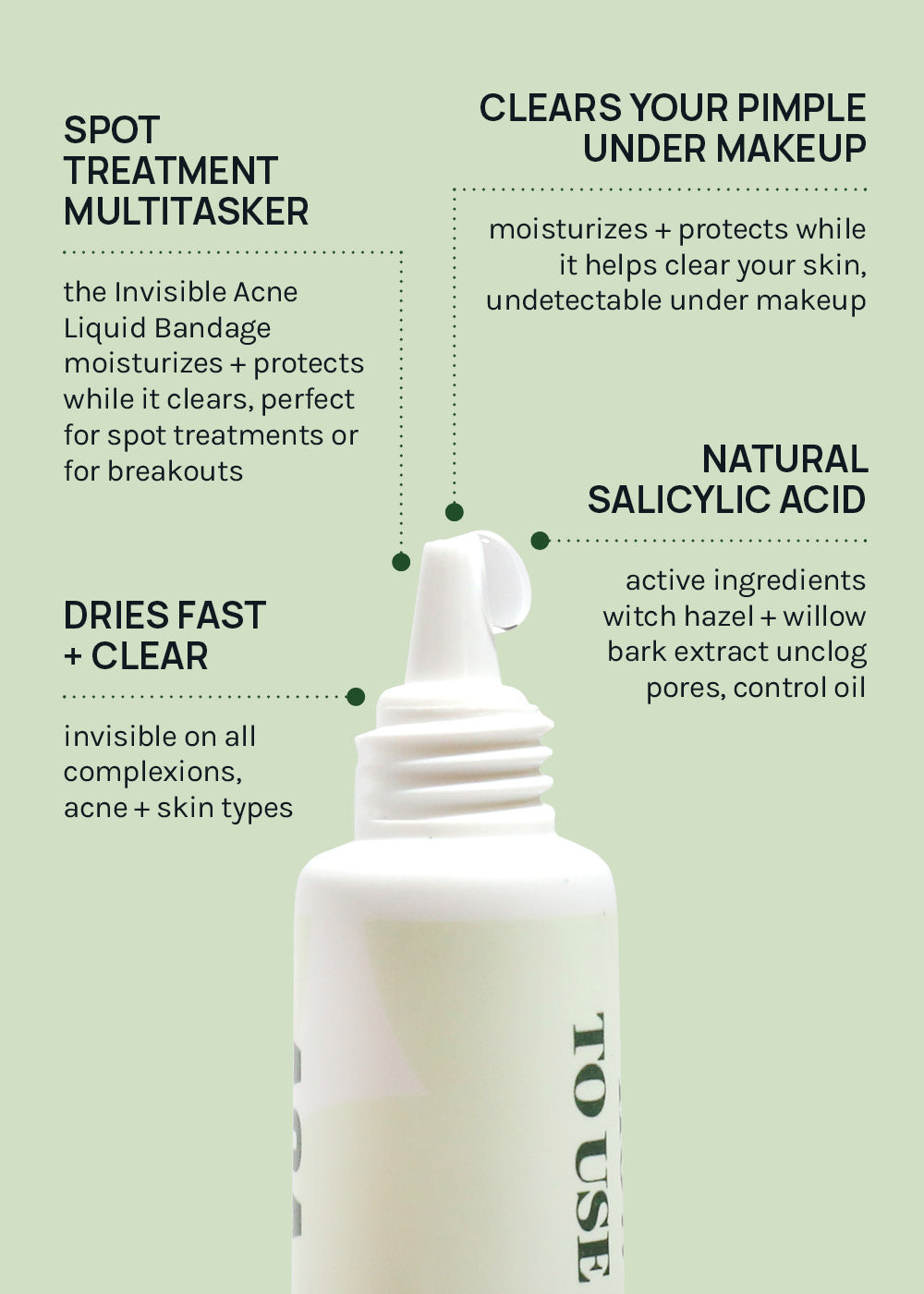 A breakthrough liquid-gel acne treatment that works like a customizable pimple patch! AOA Skin's Invisible Acne Liquid Bandage spot-treats blemishes or covers breakout areas with a fast-drying, breathable film that shields pimples from makeup + bacteria while healing.