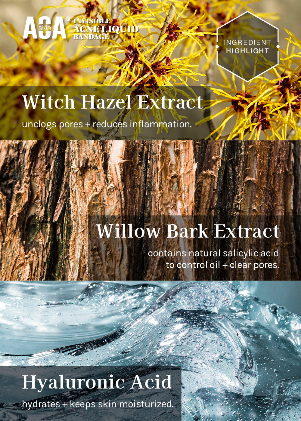 Formulated with naturally acne-fighting ingredients: Witch Hazel to unclog pores + calm redness, Willow Bark Extract with natural salicylic acid to control oil + clear pores, and Hyaluronic Acid to keep skin hydrated+ balanced.