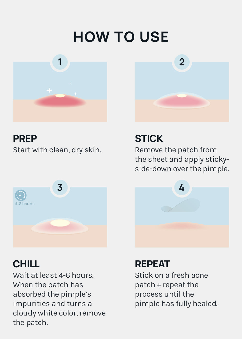 How to Use: Clean and Dry Skin. Take the Invisible Acne Patch and cover your pimple. Leave on for at least 4-6 hours (can be used overnight). Remove the patch when it has absorbed the impurities and turns a cloudy white color. Replace with a new patch if needed until the blemish has fully healed.