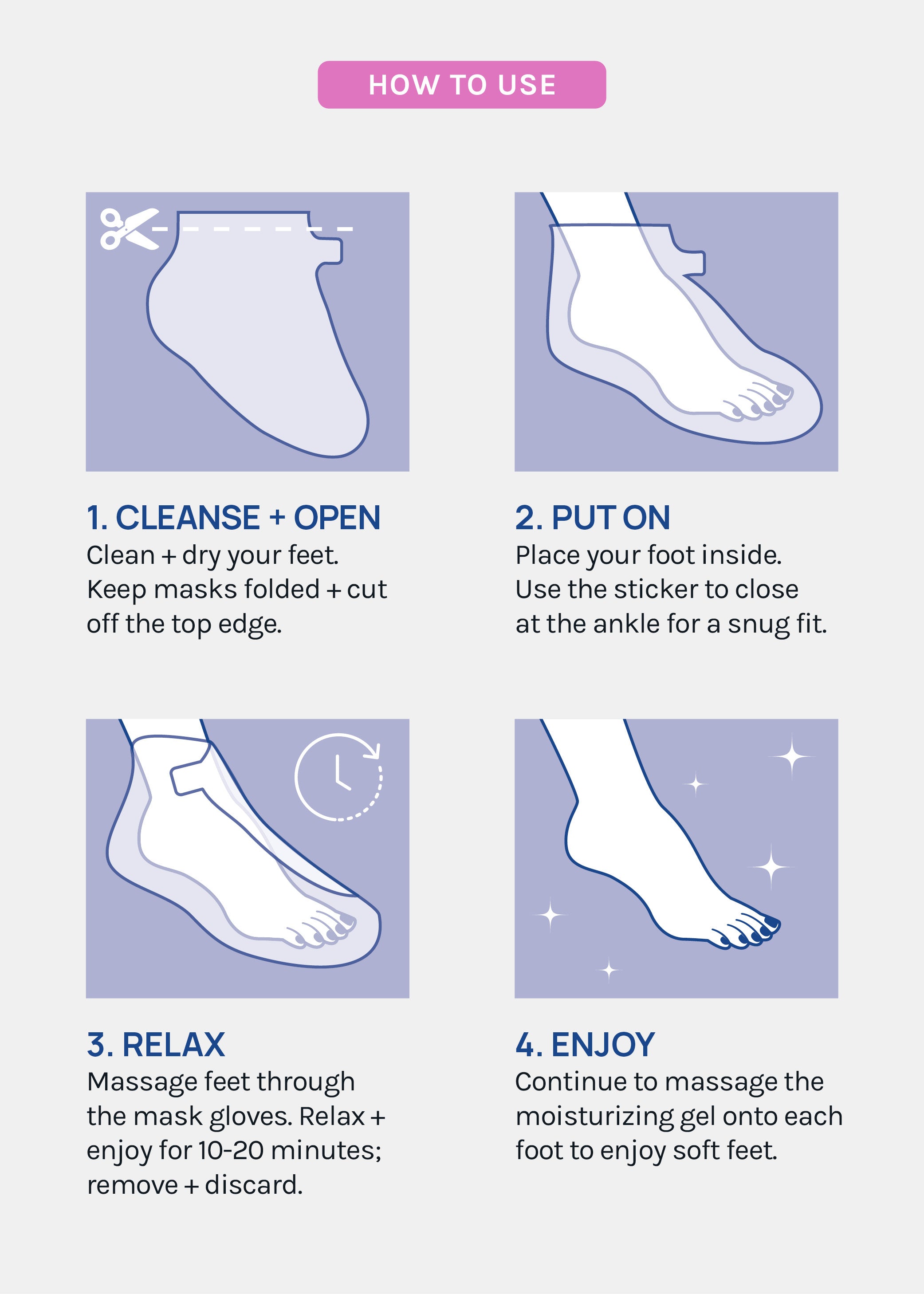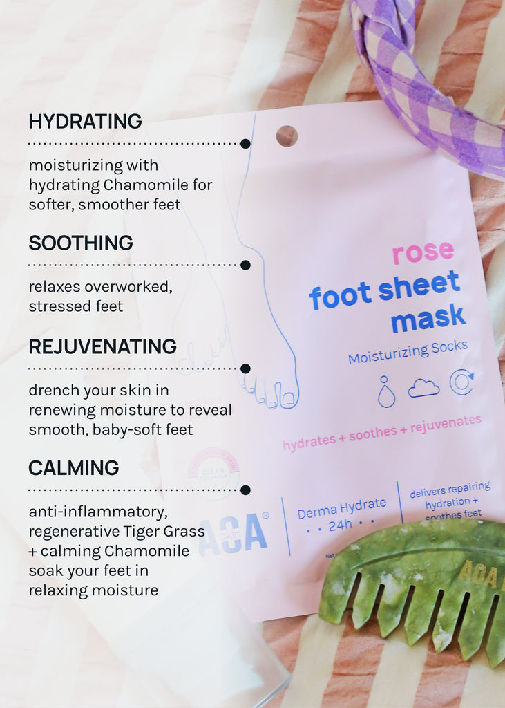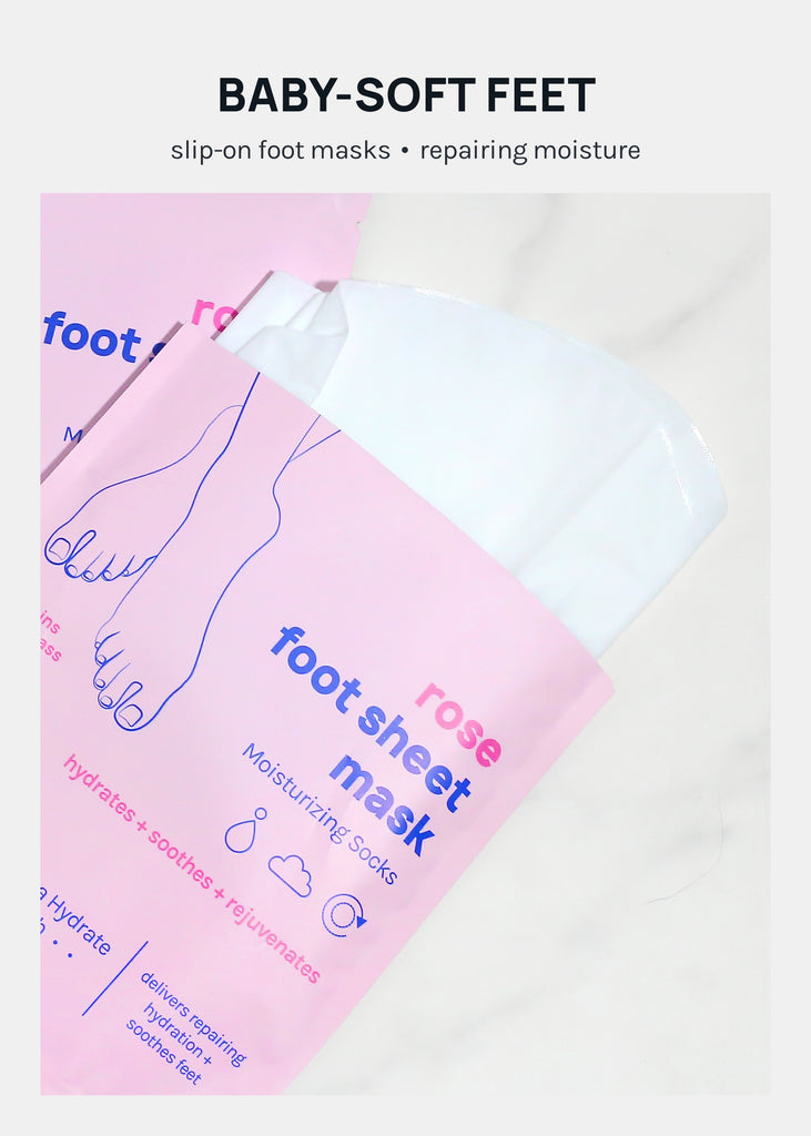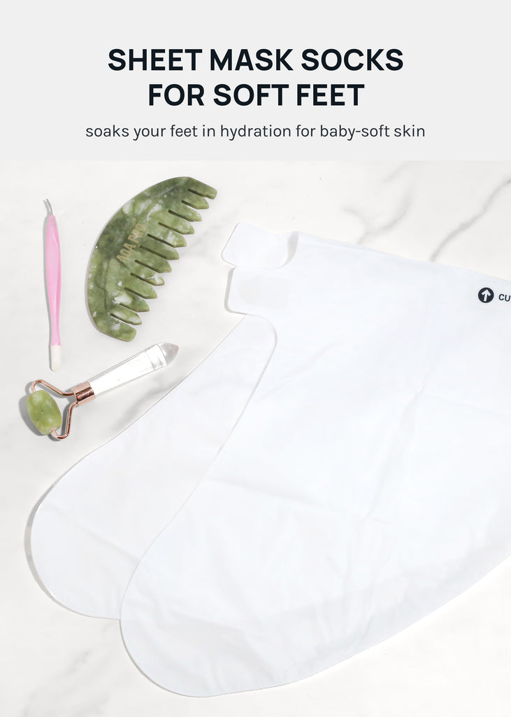Formulated with Chamomile + Tiger Grass, this Foot Sheet Mask will leave your feet moisturized + softer than ever!