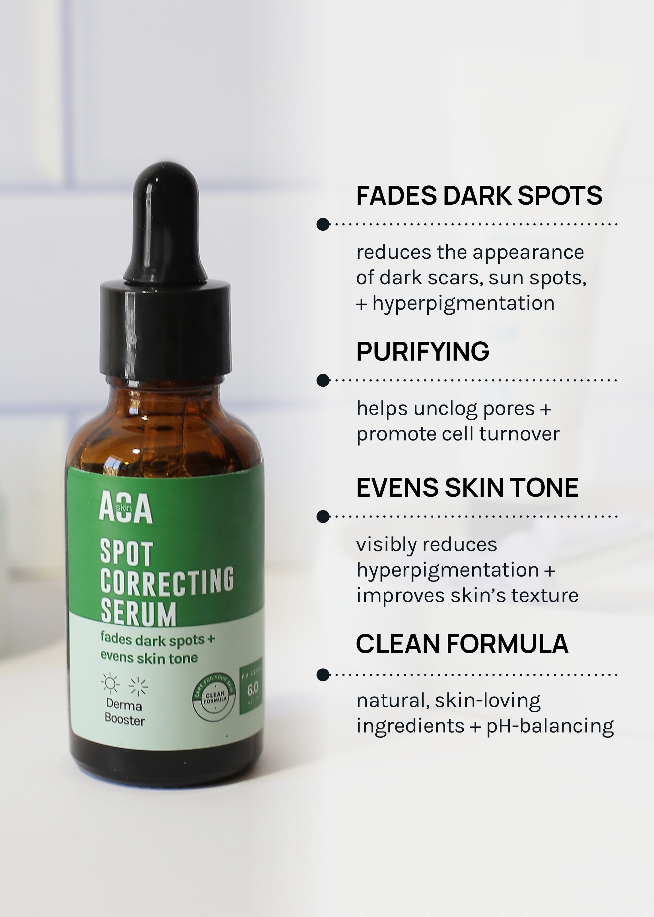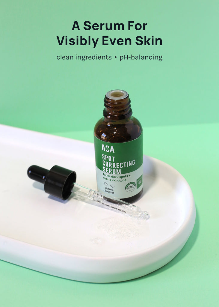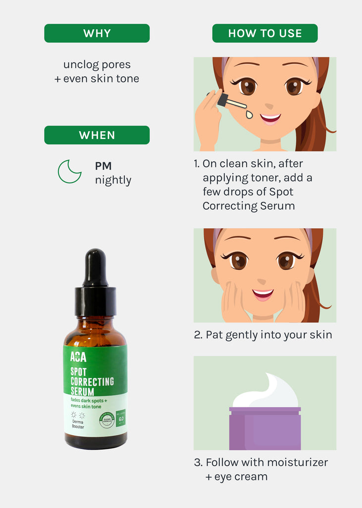 After cleansing + applying toner, gently pat a few drops of Spot Correcting Serum onto the skin. Follow with moisturizer + eye cream. Pro Tip: Avoid direct sun exposure immediately after application. Wear sunscreen on treated areas for 1 week following application.