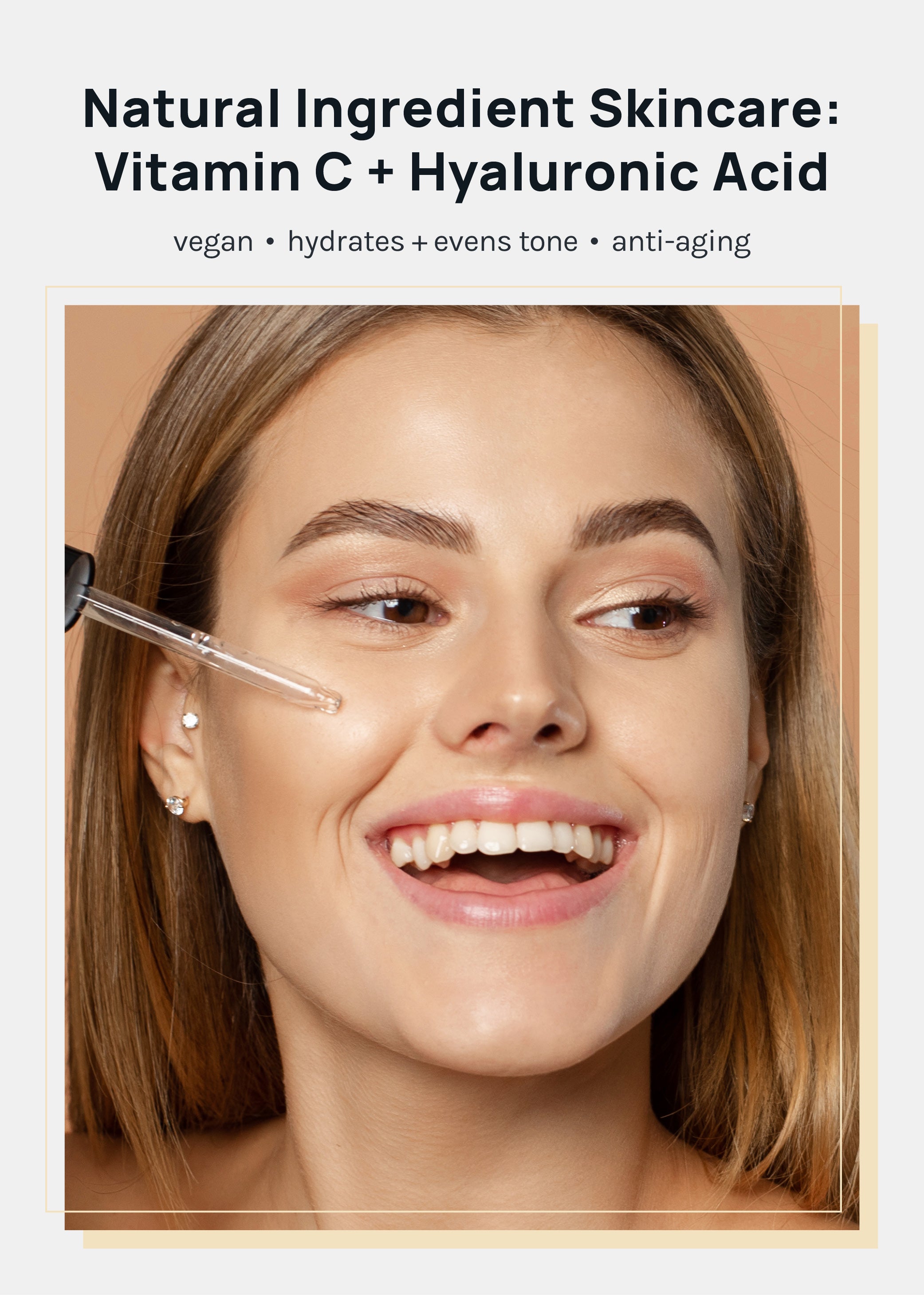 After cleansing + applying toner, gently pat a few drops of Vitamin C + Hyaluronic Acid Serum onto the skin. Follow with moisturizer + eye cream.