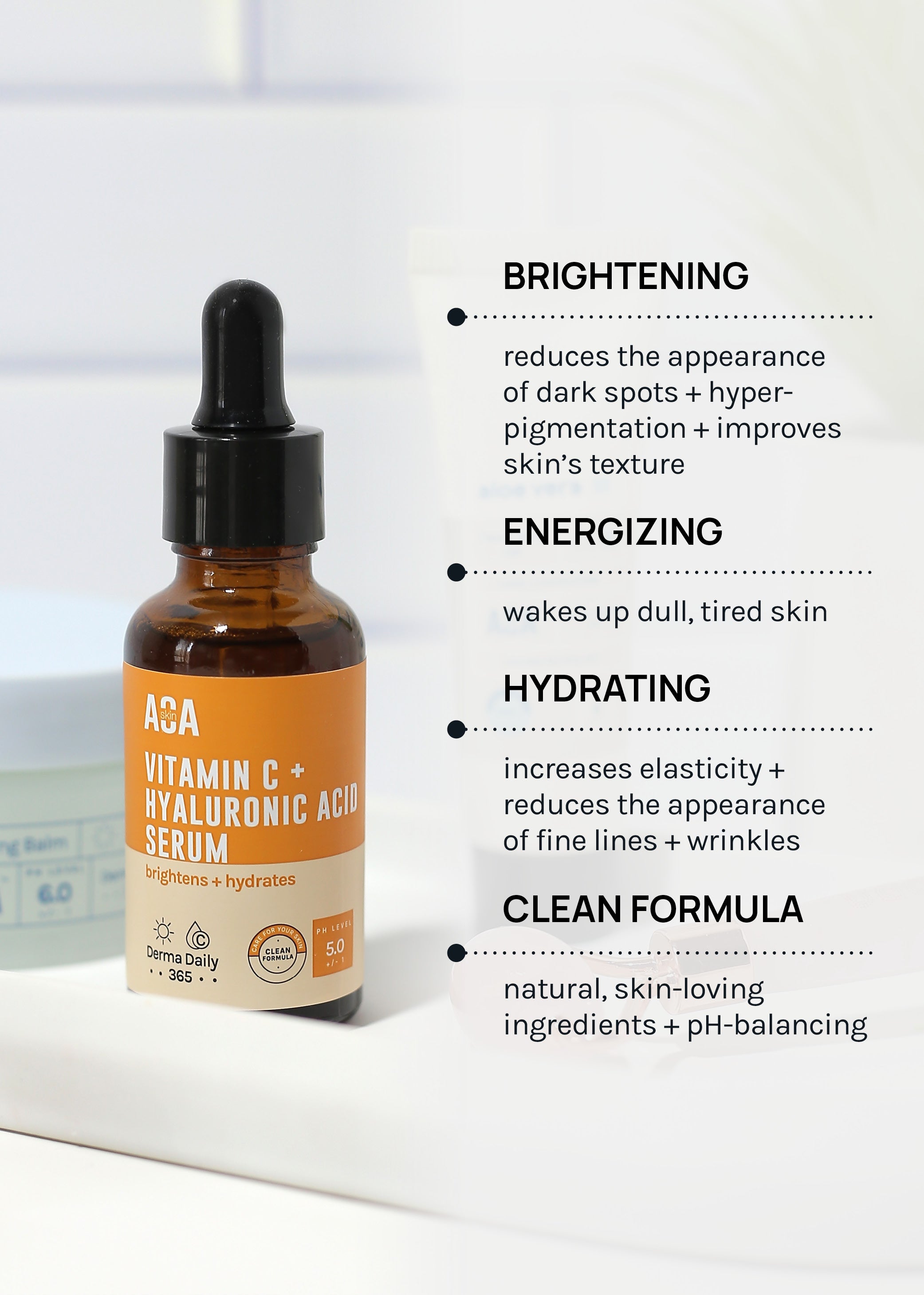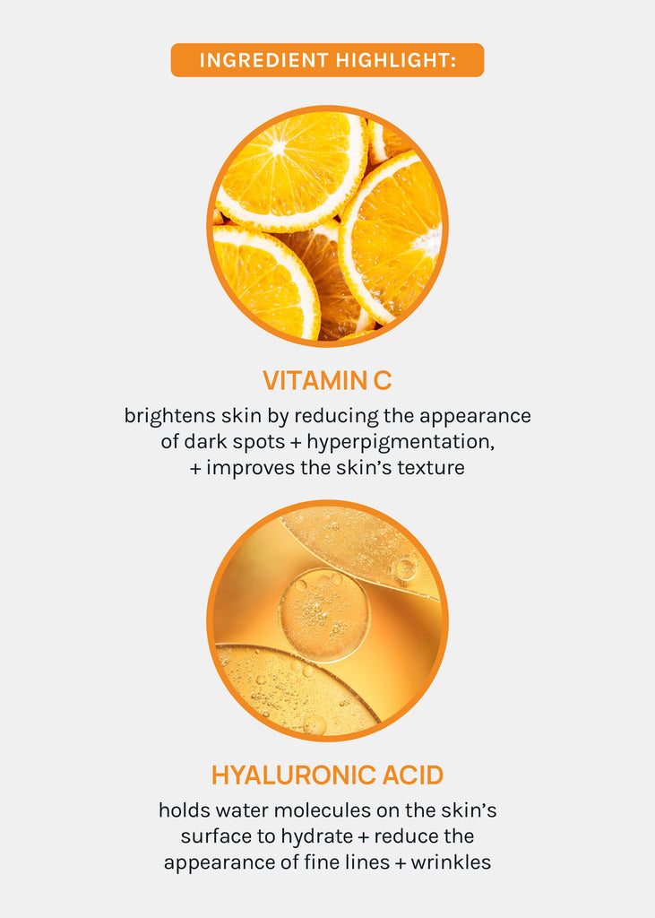 A serum formulated with Vitamin C + Hyaluronic Acid for visibly brighter + hydrated skin!