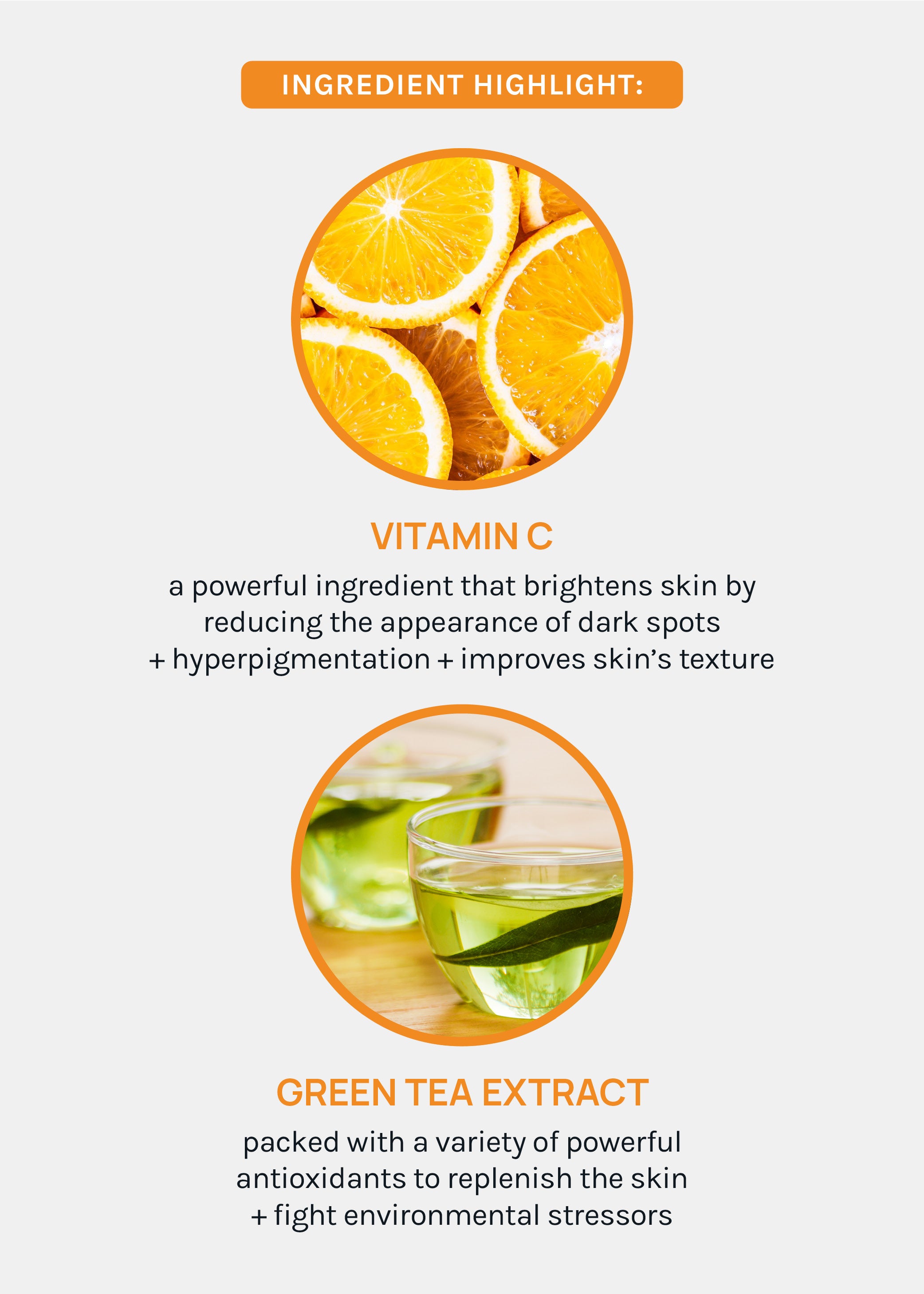 Made with Vitamin C + Green Tea Extract to brighten + recharge your skin!