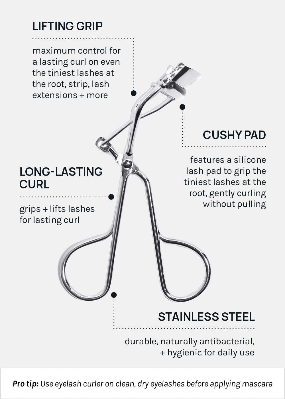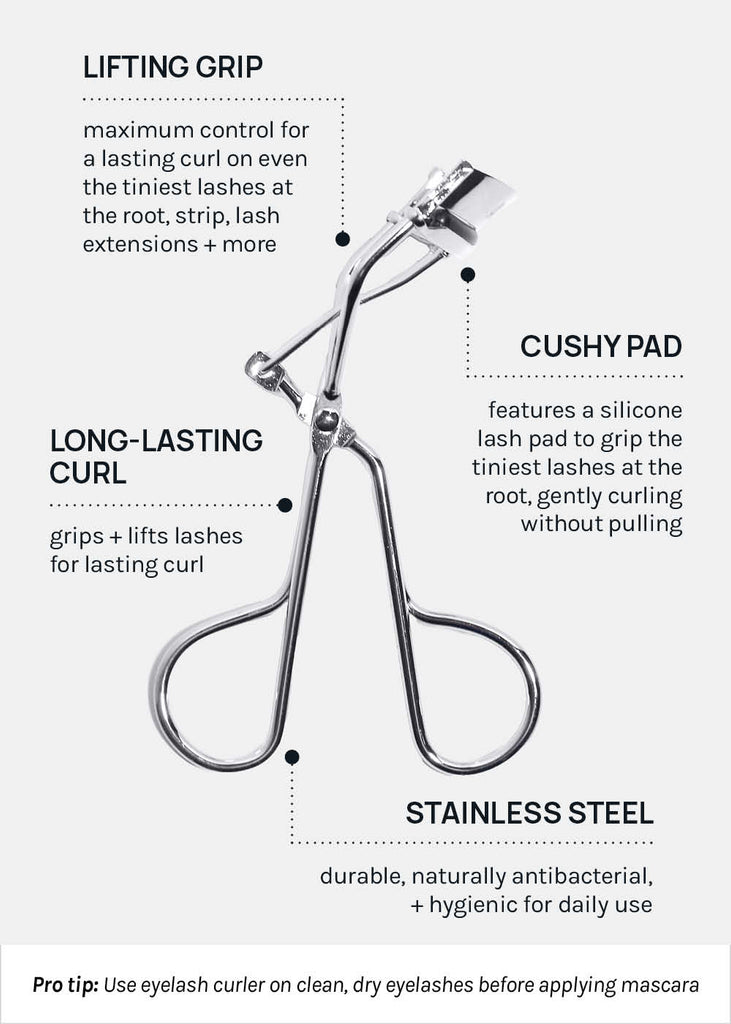 Get instantly lifted, curled lashes with our Stainless Steel Eyelash Curler, designed to fit all eye shapes effortlessly! Safely curl natural or faux lashes: extensions, individuals, + strips. Featuring a wide, curved head + a soft silicone lash pad, this lash curler grips even the tiniest lashes at the root, delivering a beautiful, long-lasting curl in seconds.