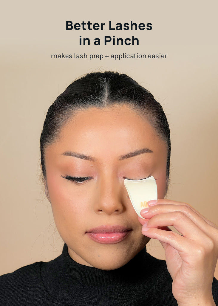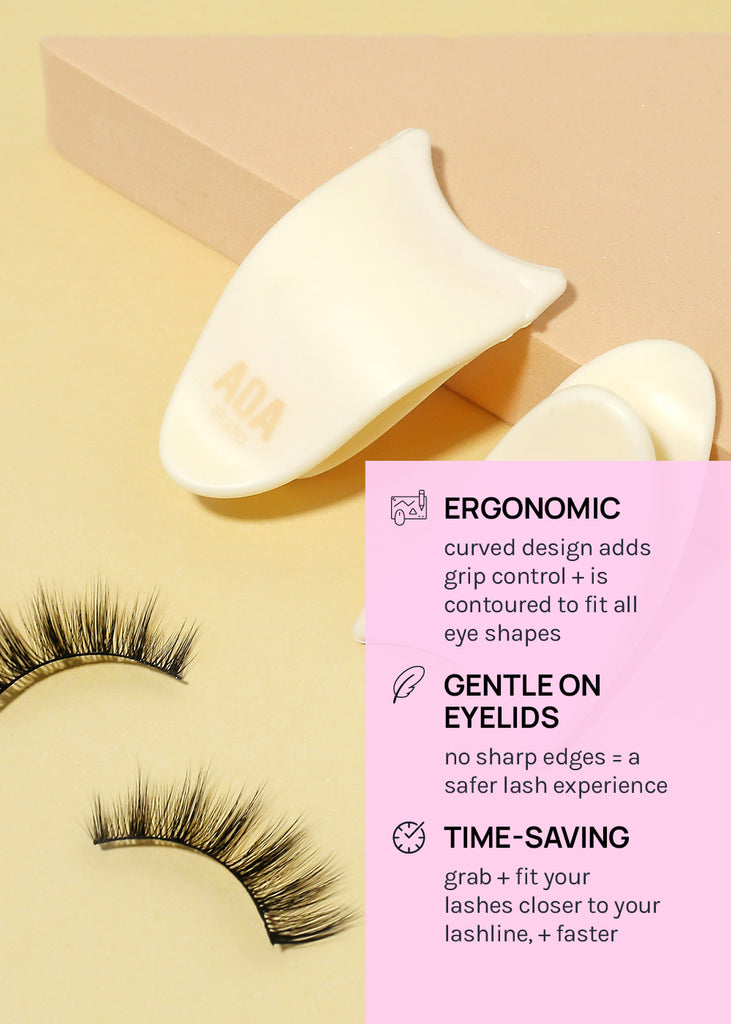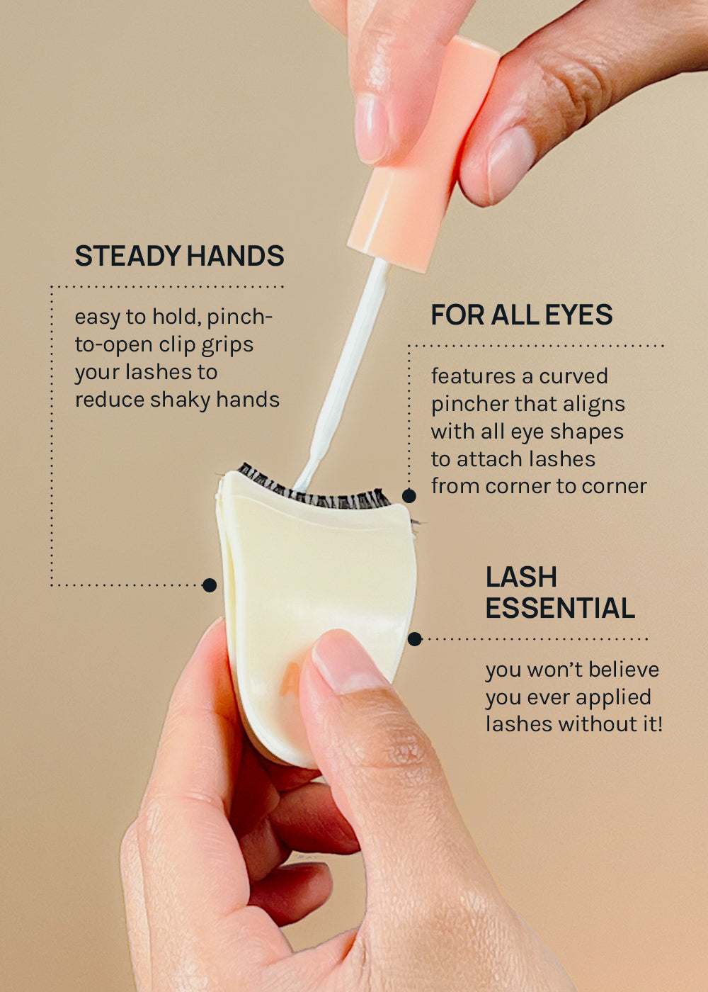 A genius tool for grabbing, positioning, + applying strip eyelashes quickly + safely. An eye-shaped pincher that fully aligns strip lashes to your eyes from corner to corner.
