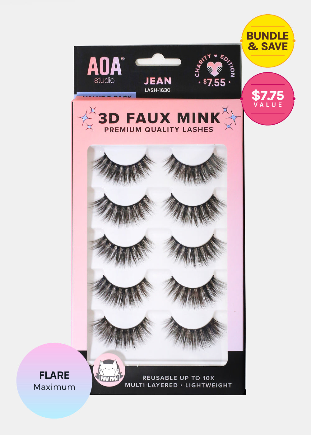Value set: 5 pairs of the AOA Jean Paw Paw lash at a discounted price! This is perfect for makeup artists or lash lovers who wear them daily. Easy and convenient packaging. Stock up now!