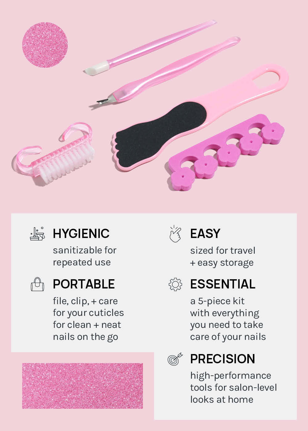 This kit contains everything you need to take care of your nails. File, clip, + care for your cuticles to keep your nails looking clean + neat on the go.