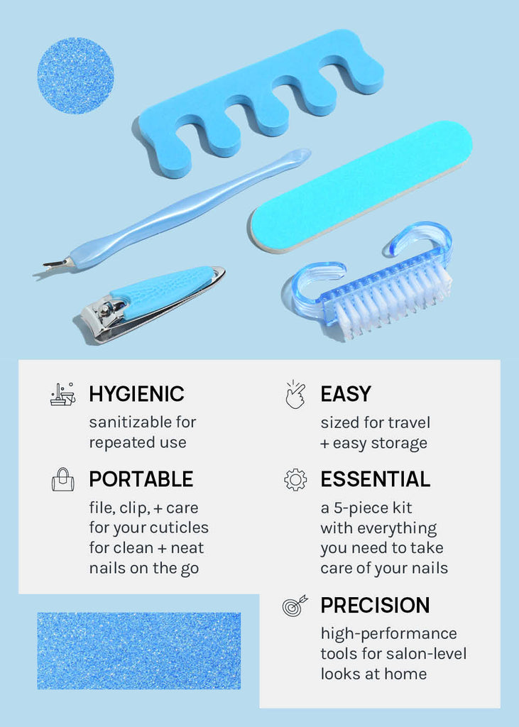 This kit contains everything you need to take care of your nails. File, clip, + care for your cuticles to keep your nails looking clean + neat on the go.