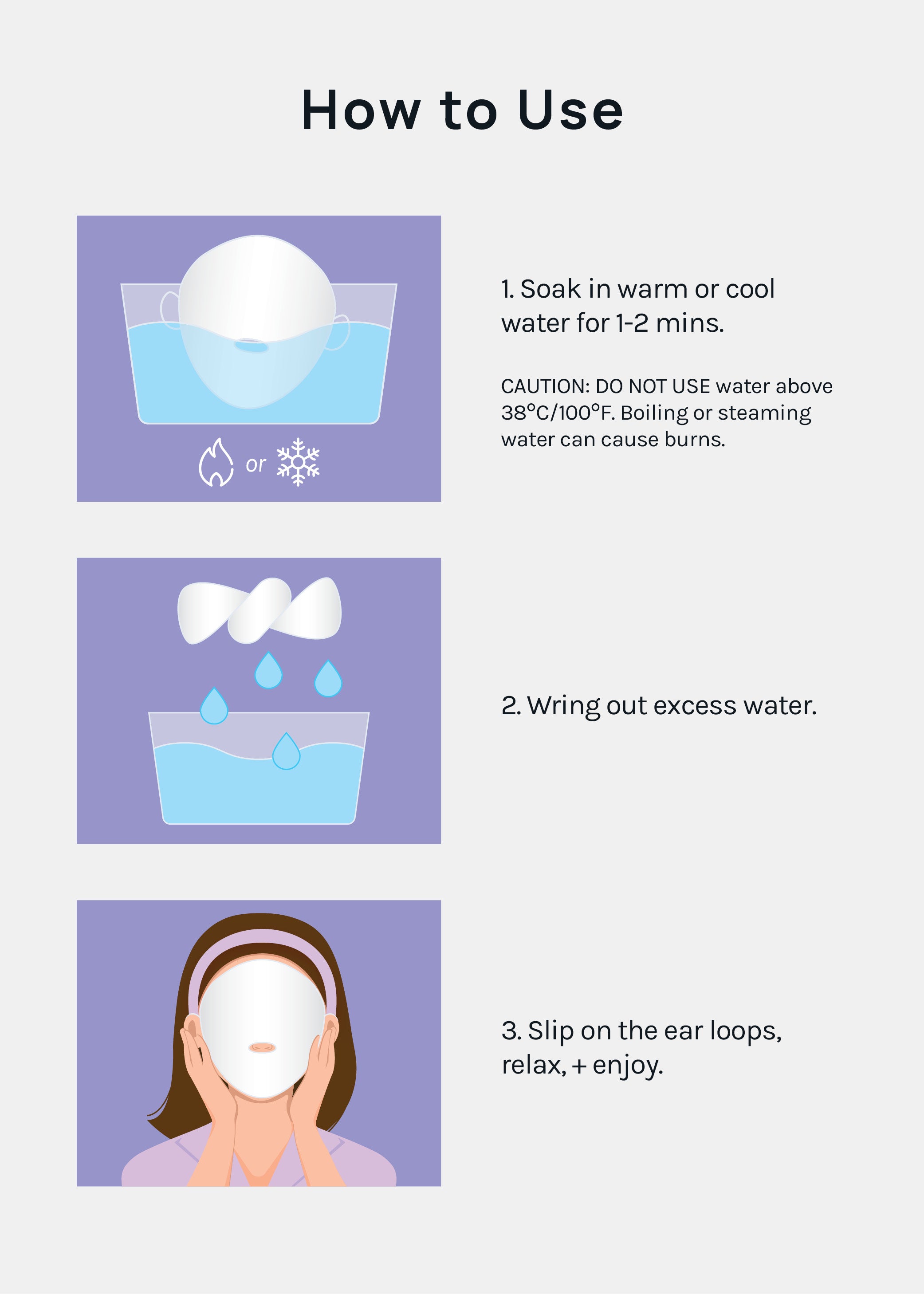 CAUTION: Use with extreme caution. DO NOT USE water above 38°C/100°F. Boiling or steaming water can cause burns. Keep away from children.