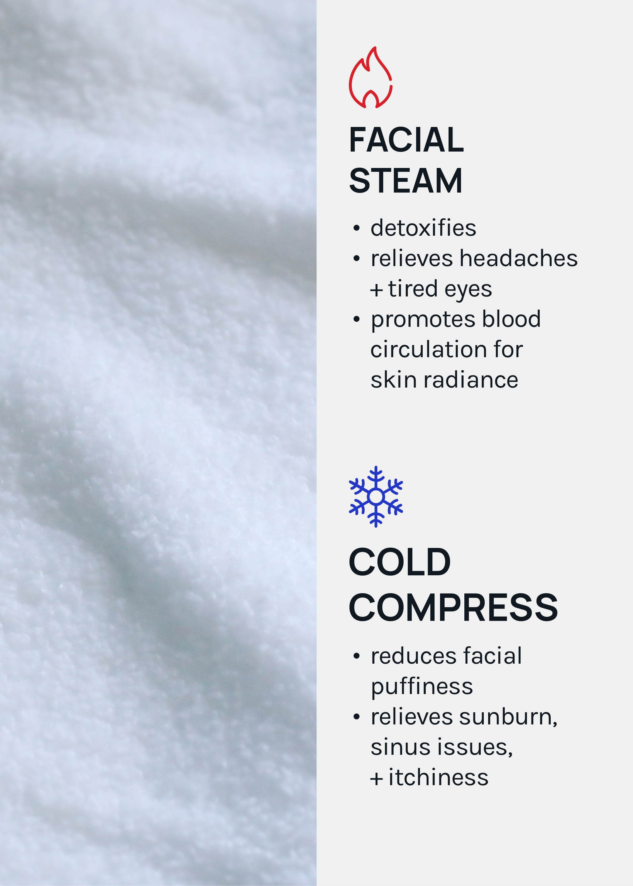 Facial steam: relieves headaches + tired eyes, detoxifies, + promotes blood circulation for skin radiance. Cold compress: reduces facial puffiness + relieves sunburn, sinus issues, + itchiness.