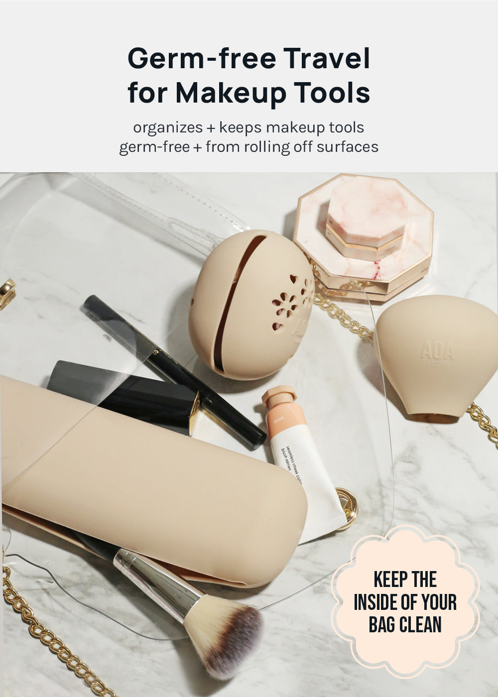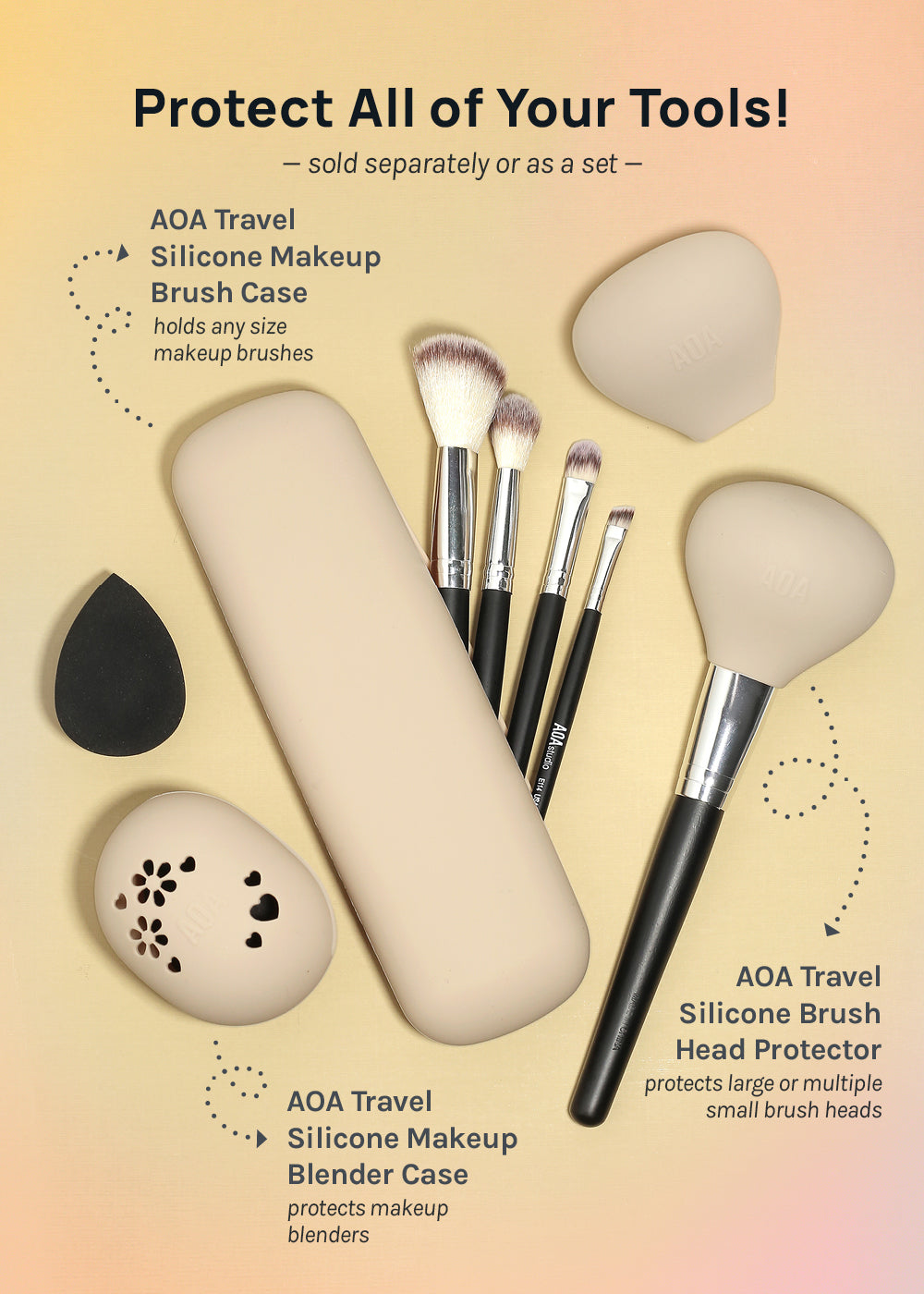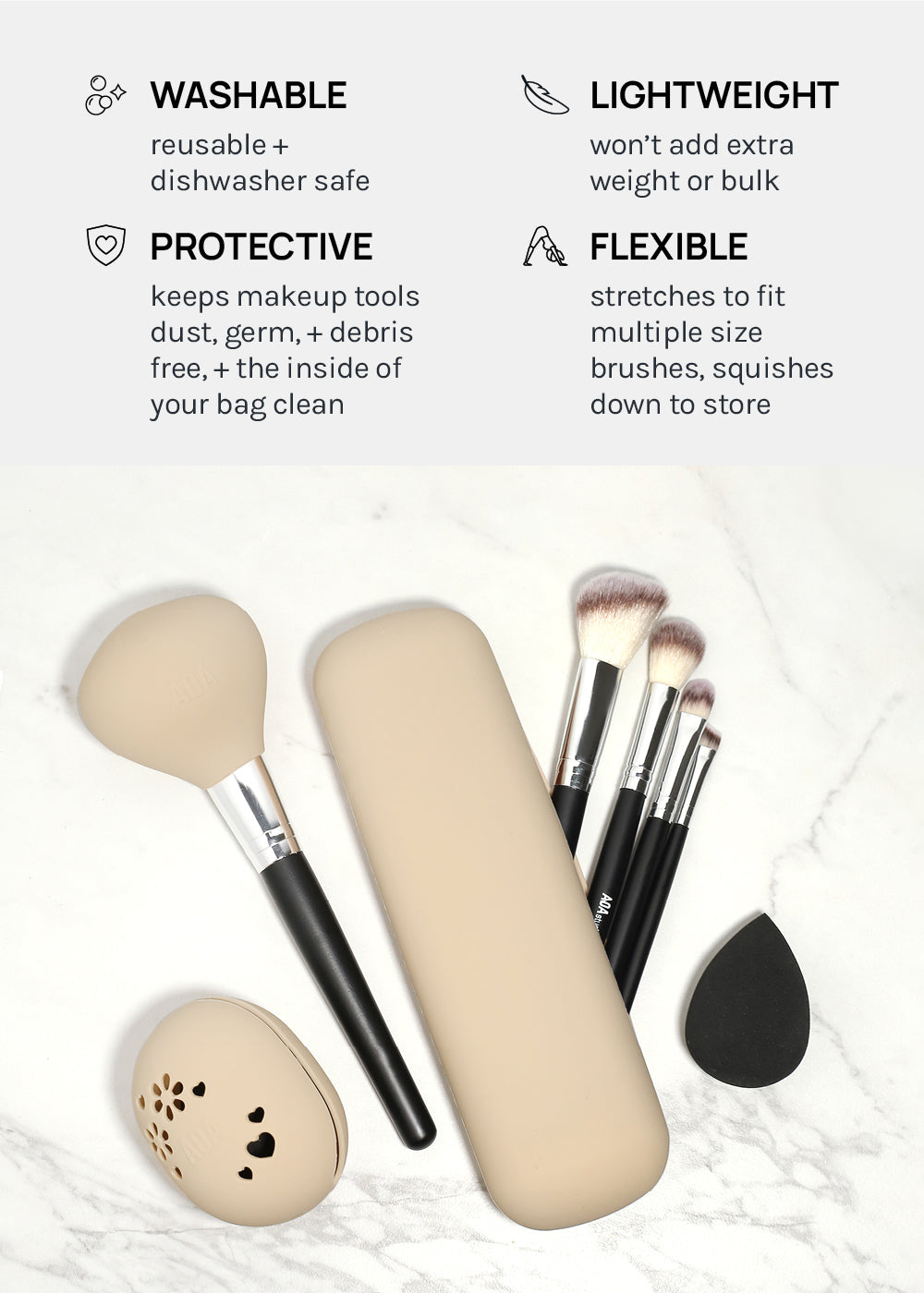 Keep makeup brushes + blenders organized, free from dirt, + safe from rolling off surfaces while on the go. The soft silicone texture makes it easy to find makeup brushes by touch in your bag or purse. All covers easily flex open to fit + grab tools + completely squish down for easy storage.