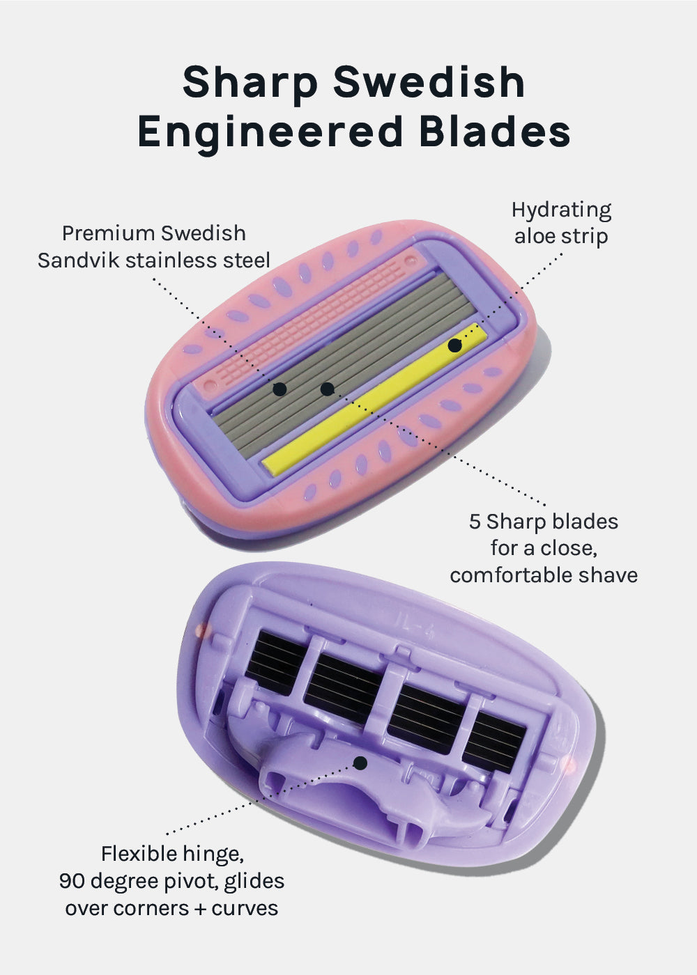 Using the highest quality Swedish steel, our blades give you a close, smooth shave every time. The ergonomic handle (that won't slip out of your hands!) and rounded edges to work with your body — knees, bikini line, for the cleanest, closest most comfortable shave.