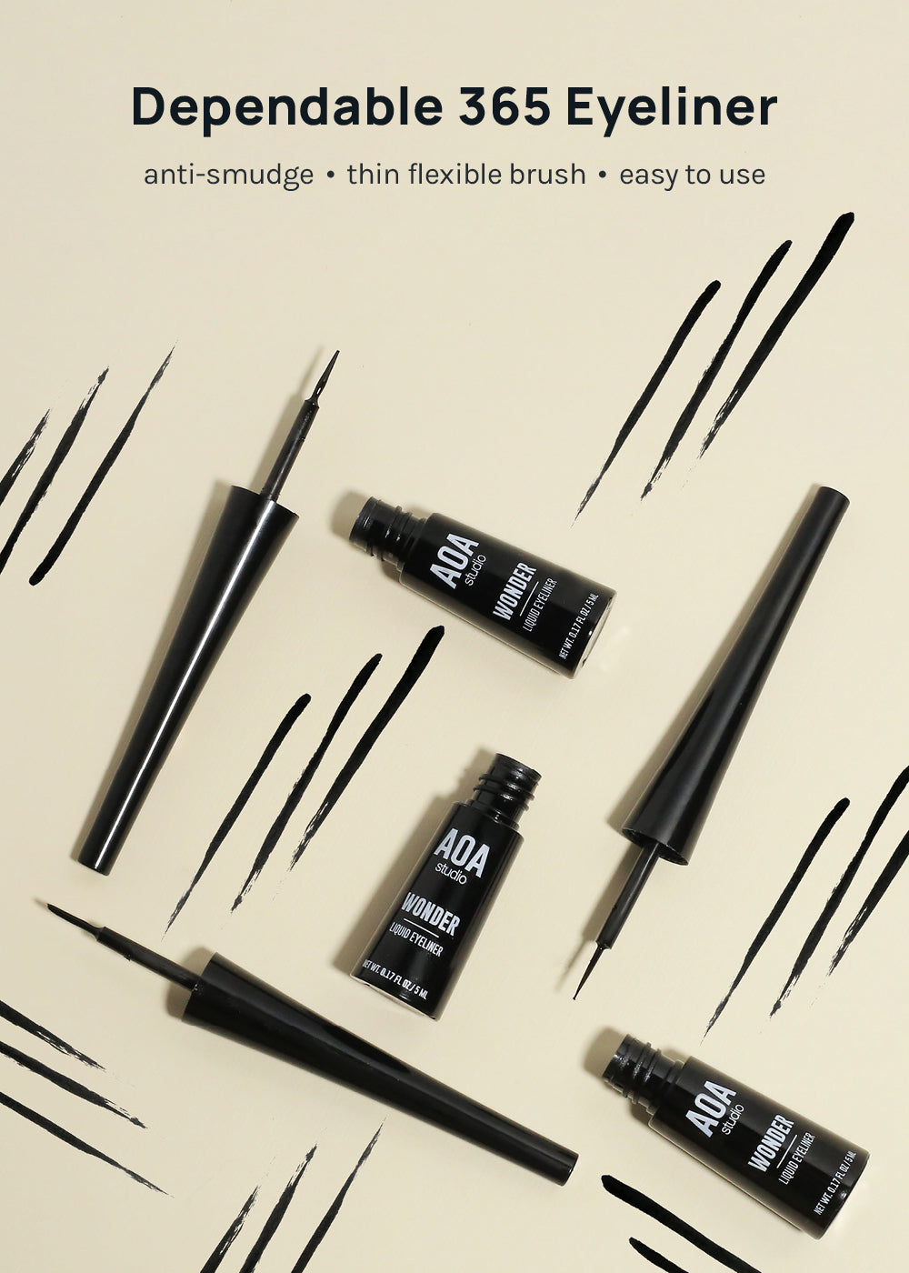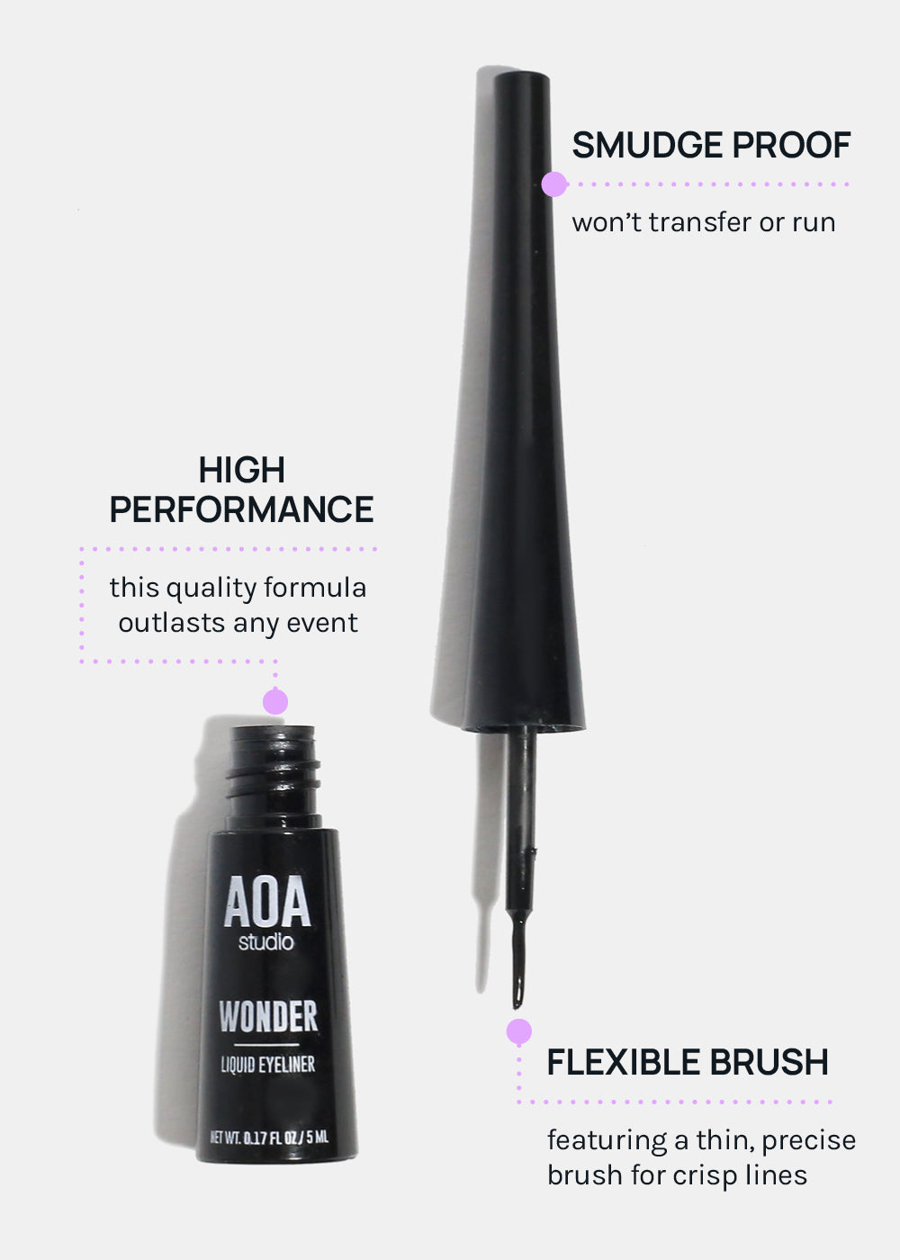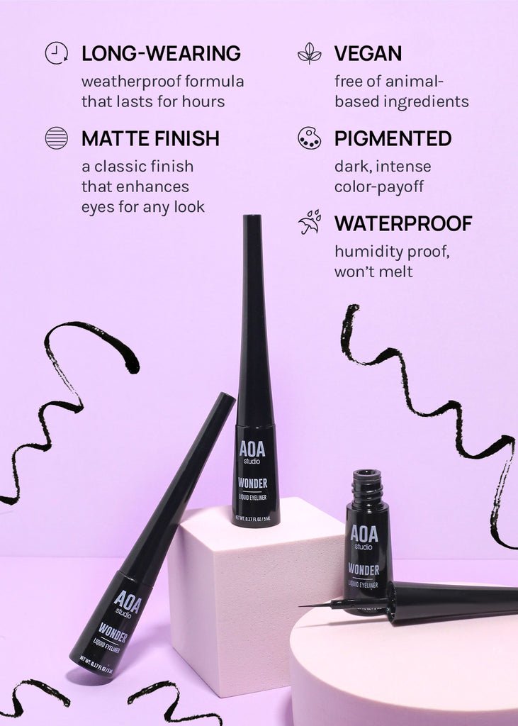 The AOA Wonder Liner is a waterproof, long lasting liquid eyeliner with a super fine brush tip. Achieve the most precise line or fill in your lash line for more defined eyes. The color sets as a dark matte black, giving your eyes a big and bold definition. Cruelty-Free.