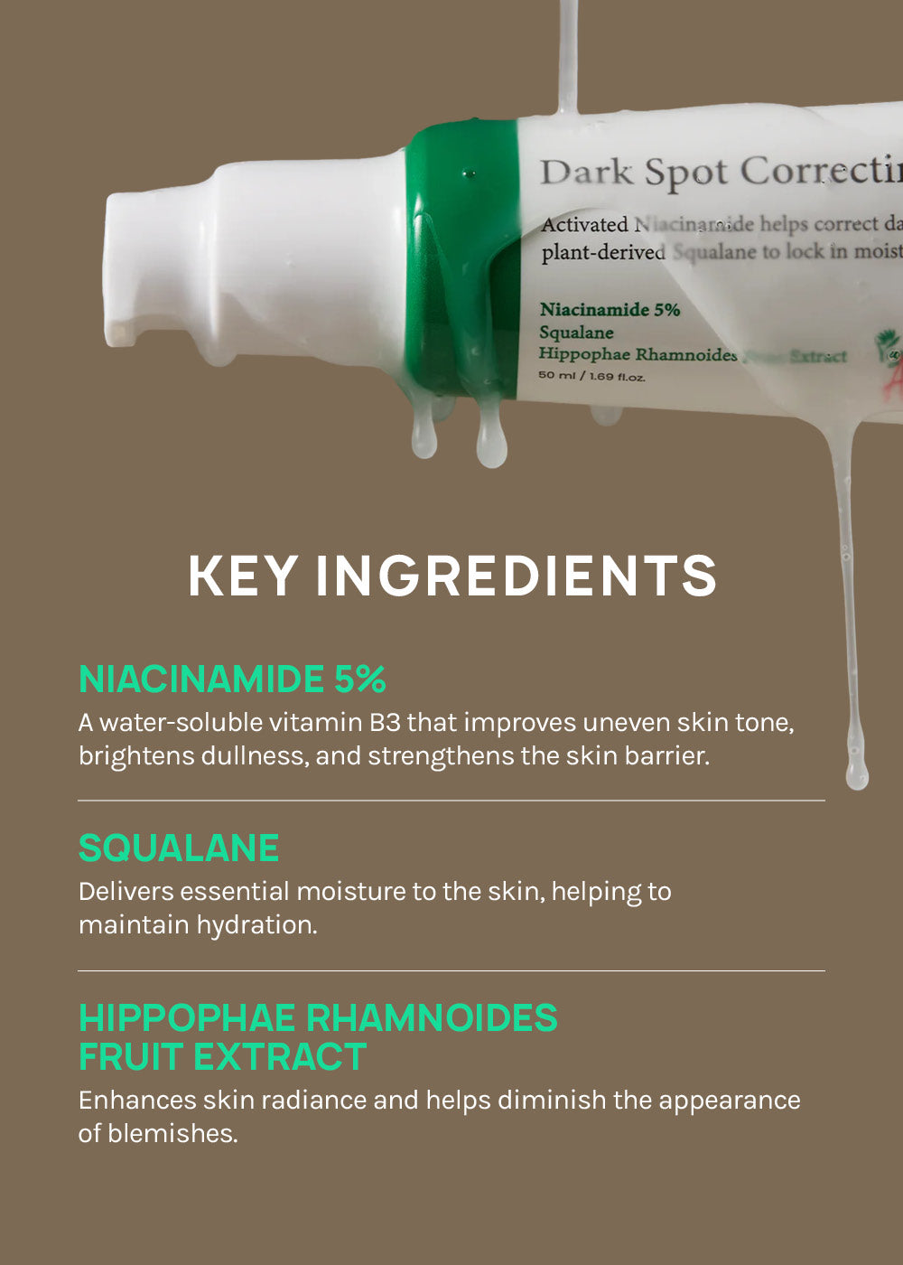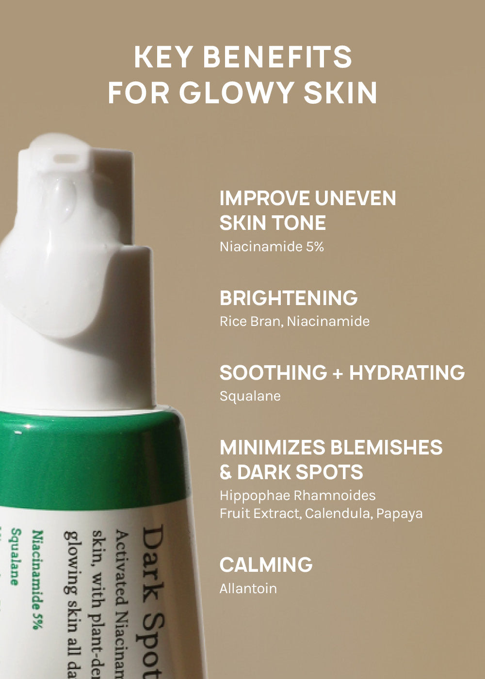 What makes it different? It’s more than just a dark spot corrector. We blend potent 5% Niacinamide with nourishing Squalane and brightening botanicals (Rice Bran, Papaya, Sea Buckthorn) to simultaneously correct, hydrate, and strengthen. Achieve noticeable results without compromising skin health or resorting to harsh ingredients.