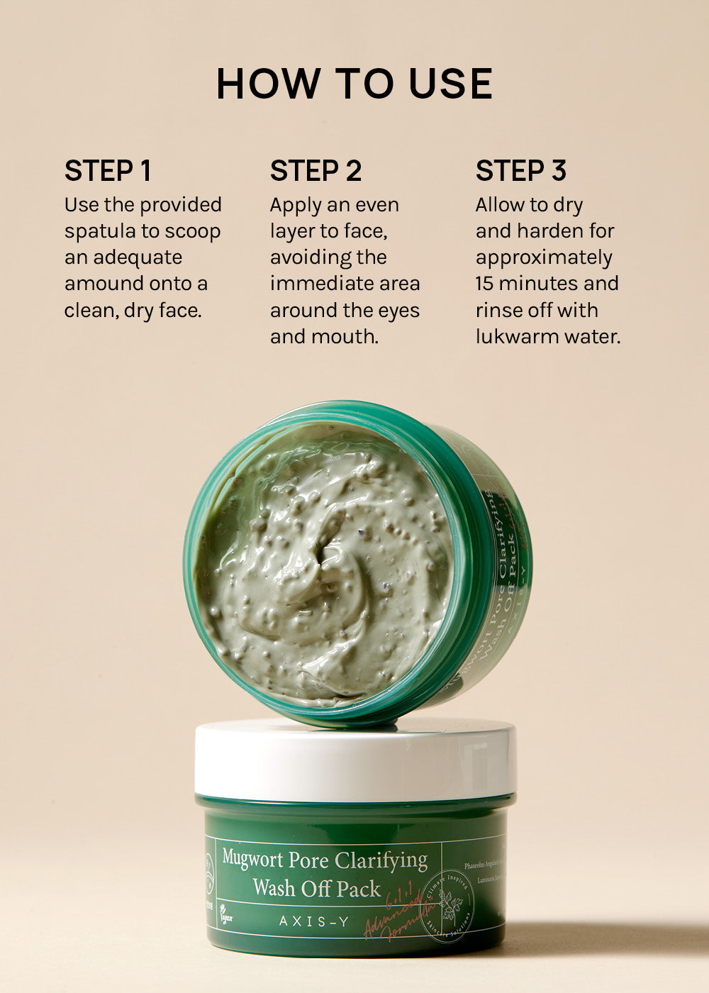 - Use the provided spatula or our No-Mess Masking Spatula to scoop an adequate amount onto a clean, dry face.