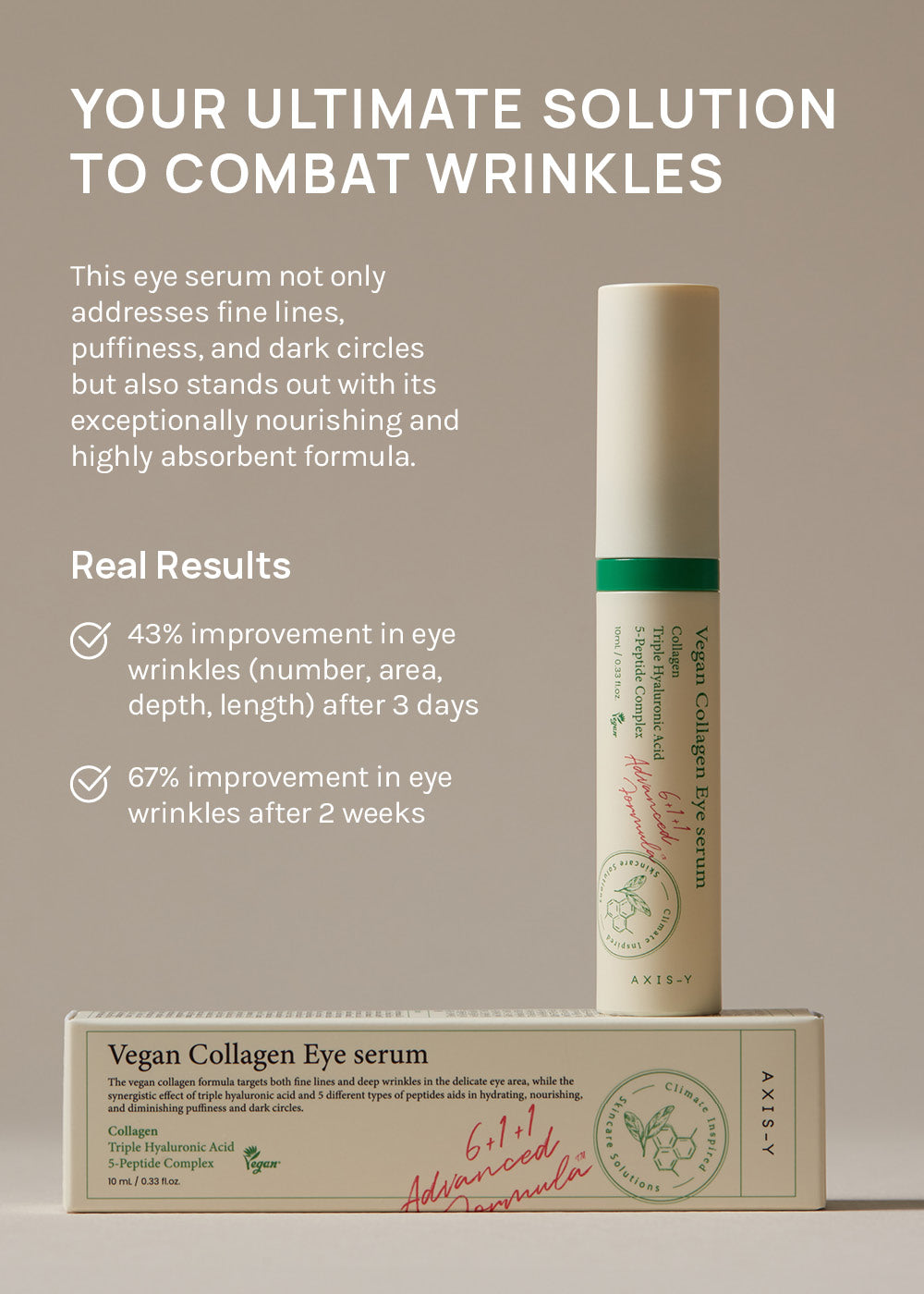 Suitable for sensitive skin and hypoallergenic, the AXIS-Y Vegan Collagen Eye Serum is clinically tested, ensuring it meets the needs of delicate skin while providing significant improvements in hydration, wrinkle reduction, and overall eye area brightness.