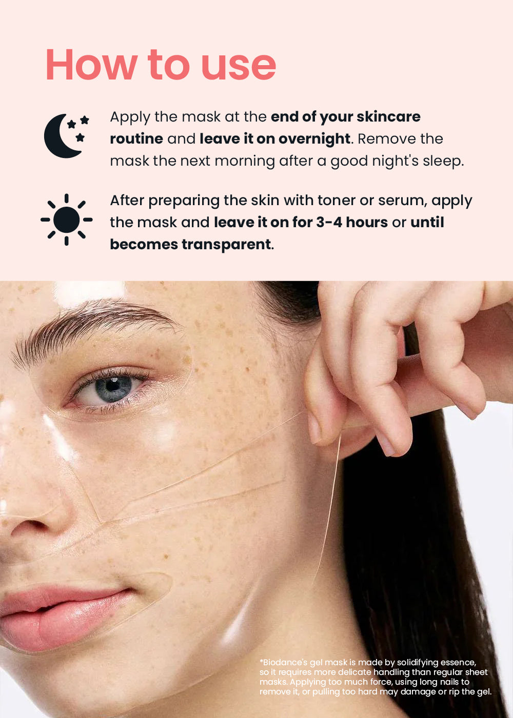 Overnight: Apply the mask at the end of your skincare routine and leave it on overnight. Remove the mask the next morning after a good night's sleep.