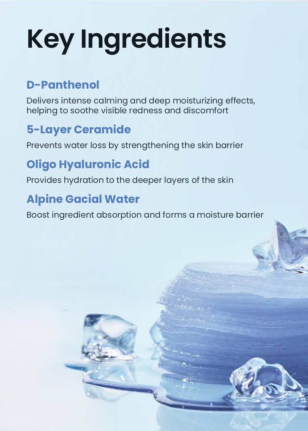 Contains D-Panthenol, 10-layered hyaluronic acid, and 5-layered ceramide to provide instant hydrating for dry and sensitive skin.