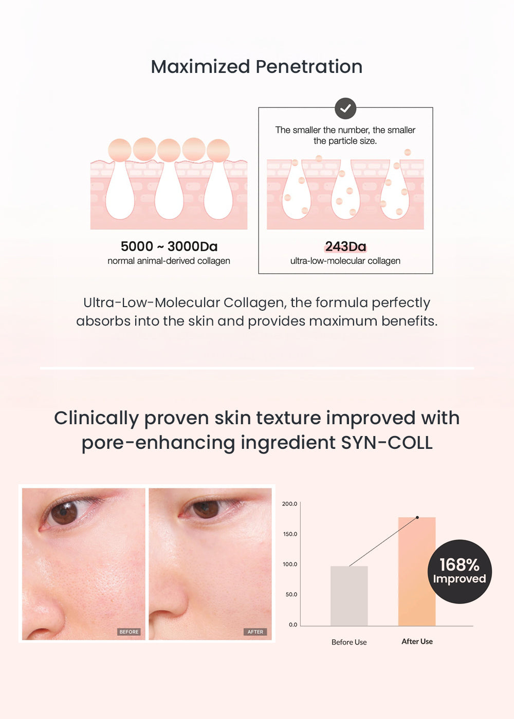 Our facial serum with ultra-low molecule collagen penetrates the skin unlike other collagen products. Improving skin texture by filling the skin irregularities — it’s the perfect liquid collagen for face.