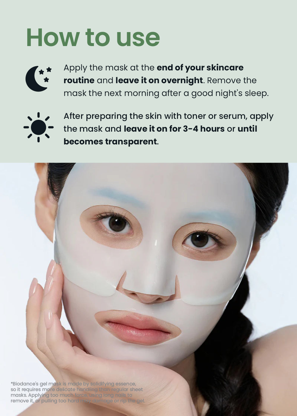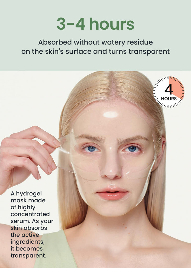 Daytime: After preparing the skin with toner or serum, apply the mask and leave it on for 3-4 hours or until it becomes transparent.