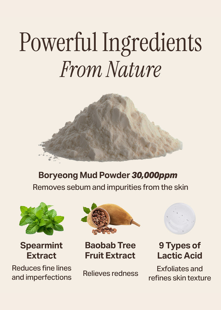 BRMUD Recovery Mud Pack to Foam Cleanser is infused with nature's best ingredients. This hydrating facewash contains clean and pure mud powder from Boryeong in South Korea, Spearmint Extract, Baobab Tree Fruit Extract, and 9 types of lactic acid that will cleanse your skin like rain cleans the atmosphere.